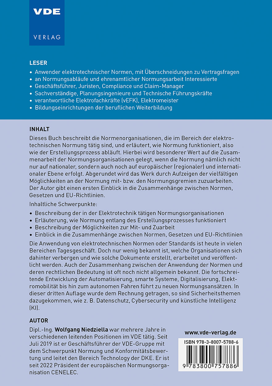 | Schlagworte | CENELEC • DIN-EN-Normen • DIN-Normen • DKE • Elektrotechnische Normung • Erarbeiten von Normen • Geschäftsgang • IEC-Standards • Normgestaltung • Normungsarbeit • Standardisierung • VDE-Bestimmungen • VDE-Vorschriftenwerk |
