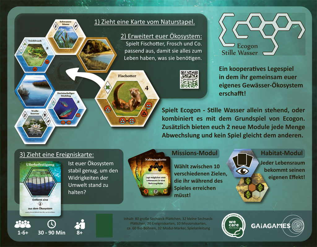 Spielt Ecogon - Stille Wasser allein stehend, oder kombiniert es mit dem Grundspiel von Ecogon.Zusätzlich bieten euch 2 neue Module jede Menge Abwechslung und kein Spiel gleicht dem anderen.