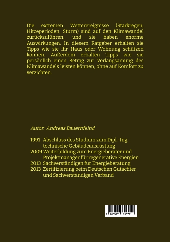 Die extremen Wetterereignisse (Starkregen, Hitzeperioden, Sturm) sind auf den Klimawandel zurückzuführen, und sie haben enorme Auswirkungen. In diesem Ratgeber erhalten sie Tipps wie sie ihr Haus oder Wohnung schützen können. Mit den Tipps könne sie das Makroklima in und um dem Haus verbessern und damit ihre Lebensqualität. Außerdem erhalten Tipps wie sie persönlich einen Betrag zur Verlangsamung des Klimawandels leisten können, ohne auf Komfort zu verzichten.