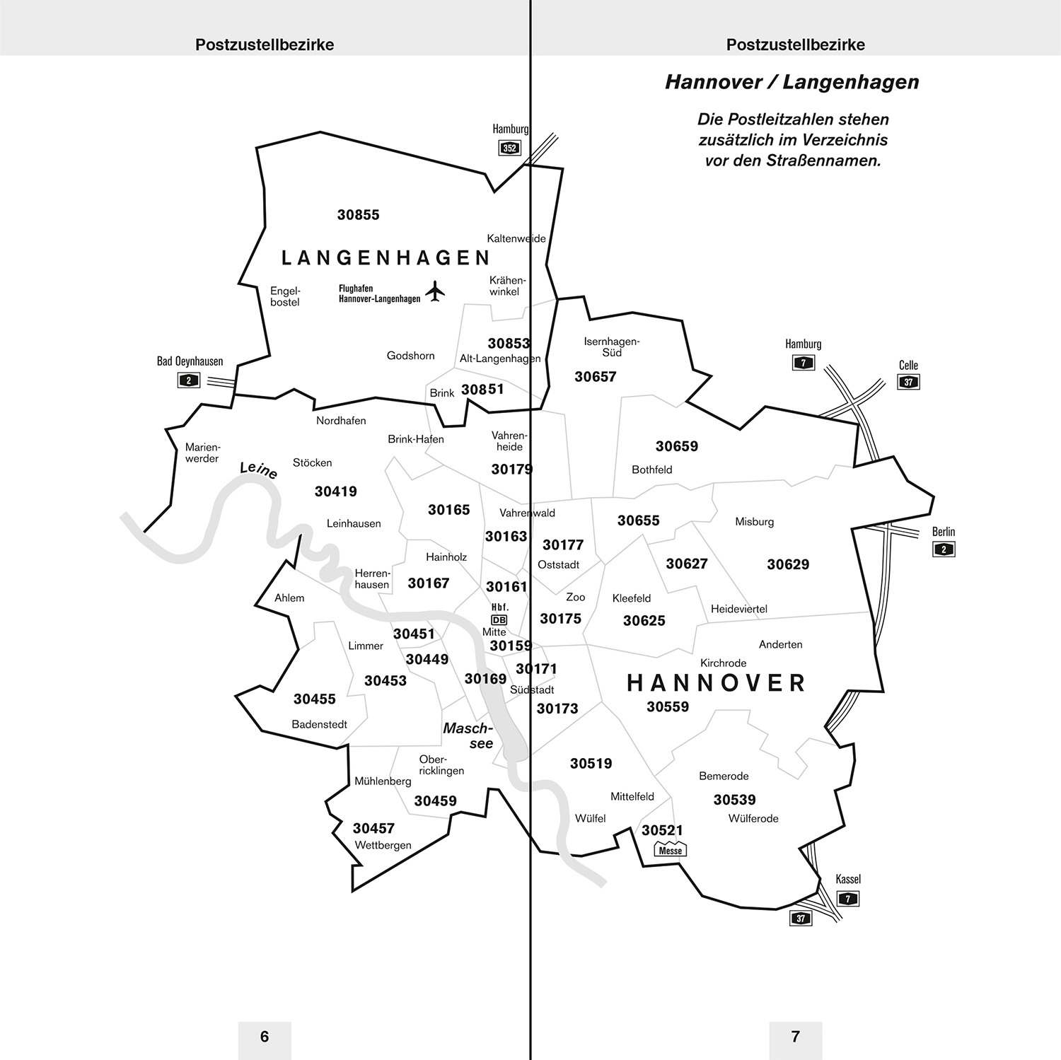 Hauptkarte 1:20 000 mit mehrsprachiger Legende (D, GB, F) - Cityplan Hannover 1:10 000 - Durchfahrtsplan 1:125 000; Auf der Rückseite: - Regionalkarte 1:150 000 mit mehrsprachiger Legende (D, GB) - ÜSTRA Stadtbahnnetz Hannover - Busnetz Hannover im Registerheft - Hannover Airport Lageplan - Deutsche Messe Hannover Messeplan; Im Registerheft: - Karte der Postzustellbezirke - Straßenverzeichnis mit Postleitzahlen und Suchfeldangaben - Daten und Fakten