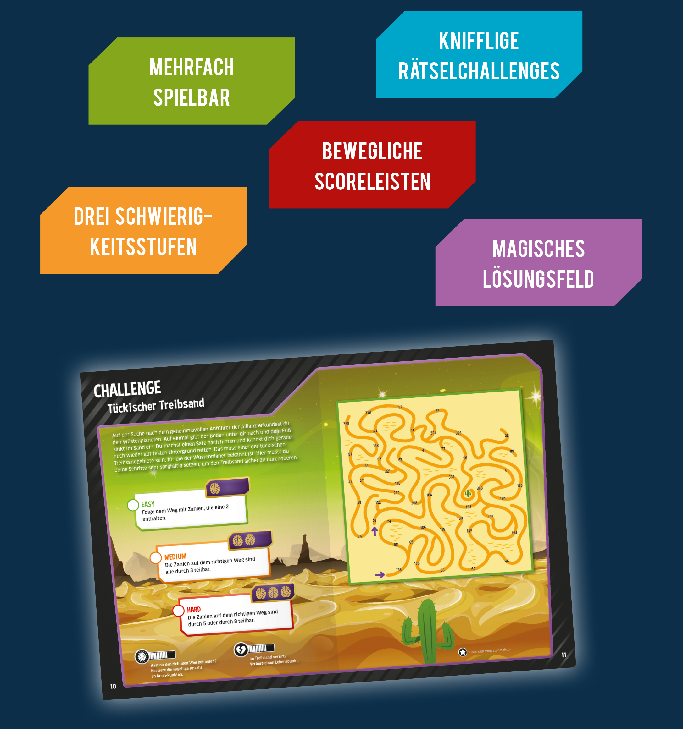 Das Buch ist mehrfach spielbar: Immer wieder und auf verschiedenen Rätsel-Wegen können sich die Challenge-Fans mit dem Rätsel-Game-Buch messen. Dabei wählen sie die Schwierigkeitsstufen selbst.
