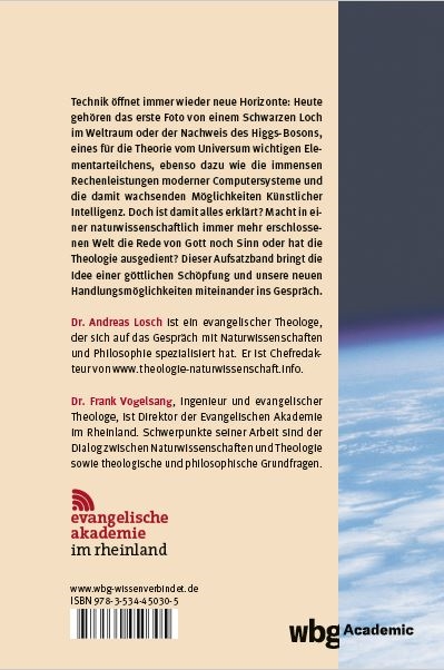 | Schlagworte | Algorithmen • Digitalisierung • Evangelische Akademie im Rheinland • Evolution • Gentechnik • Glaube • Intelligent Design • Klimawandel • Kosmologie • Kreationsismus • Künstliche Intelligenz • Mobilität • Nachhaltigkeit • Naturwissenschaften • Ökosystem • Pandemie • Schöpfung • Technikethik • Theologie • Universum • wbg Publishing Services • Wissensgesellschaft |