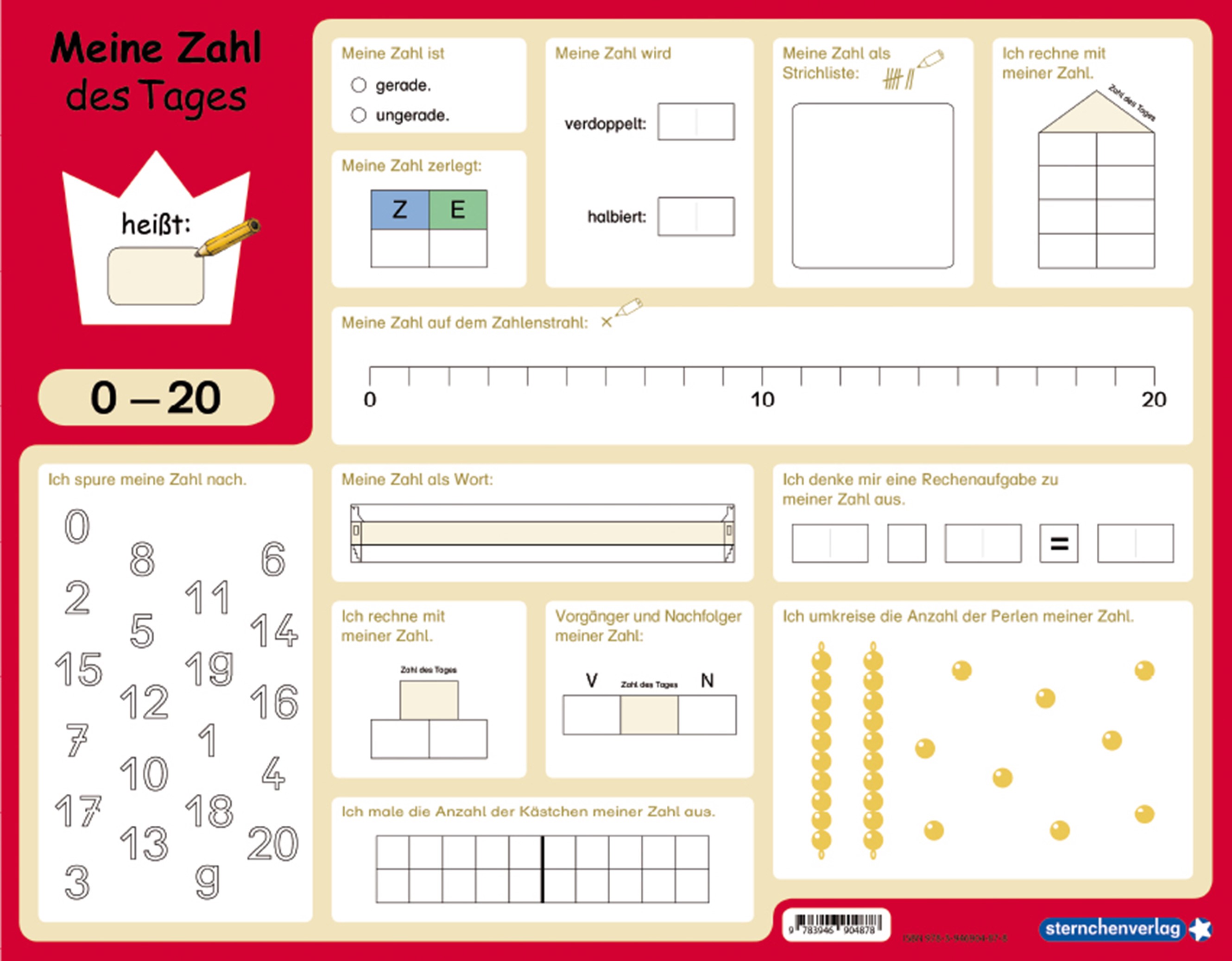 Jedes Kind kann auf dieser wiederbeschreibbaren Lerntafel zahlreiche Aufgaben zu der Zahl des Tages von 0 bis 10 (Vorderseite) und 0-20 (Rückseite) mit Spaß und großem Lernerfolg üben. Sie wurde entsprechend dem Lehrplan von Lehrer*innen entwickelt und ist bereits erprobt!Und so geht ihr vor:Überlege dir als erstes eine Zahl im Zahlenraum 0-10. Schreibe sie mit dem beiliegenden Folienstift in die Krone. Mit dieser Zahl löst du nun verschiedene Aufgaben. Hierbei stellst du sie auf verschiedene Weise dar und rechnest mit ihr. Zeige deinen Eltern oder deiner Lehrkraft deine Ergebnisse. Wische anschließend die Lerntafel mit einem trockenen Tuch wieder ab. Nun kannst du mit einer anderen Zahl im vorgegeben Zahlenraum fortfahren. Das Arbeiten mit diesem Rechenfeld macht sehr viel Spaß und du lernst dabei sehr schnell. Diese große Mathetafel ist praktisch und stabil, prima geeignet für den täglichen Gebrauch im Unterricht und für zu Hause.Trocken abwischbar ohne zu schmieren und ohne Farbrückstände. Maße: 32,5 x 25 cm (Vorder- und Rückseite) mit Spezialstift - Made in GermanyIn der Reihe erschienen: Meine Zahl des Tages 0-10 und 0-20 mit Stift - ISBN 978-3-946904-87-8Meine Zahl des Tages 0-100 - ISBN 978-3-946904-88-5Meine Zahl des Tages 0 - 1000 - ISBN 978-3-946904-89-2