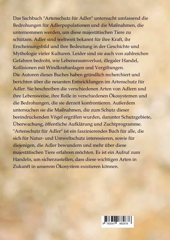 Das Sachbuch "Artenschutz für Adler" untersucht umfassend die Bedrohungen für Adlerpopulationen und die Maßnahmen, die unternommen werden, um diese majestätischen Tiere zu schützen. Adler sind weltweit bekannt für ihre Kraft, ihr Erscheinungsbild und ihre Bedeutung in der Geschichte und Mythologie vieler Kulturen. Leider sind sie auch von zahlreichen Gefahren bedroht, wie Lebensraumverlust, illegaler Handel, Kollisionen mit Windkraftanlagen und Vergiftungen.Die Autoren dieses Buches haben gründlich recherchiert und berichten über die neuesten Entwicklungen im Artenschutz für Adler. Sie beschreiben die verschiedenen Arten von Adlern und ihre Lebensweise, ihre Rolle in verschiedenen Ökosystemen und die Bedrohungen, die sie derzeit konfrontieren. Außerdem untersuchen sie die Maßnahmen, die zum Schutz dieser beeindruckenden Vögel ergriffen wurden, darunter Schutzgebiete, Überwachung, öffentliche Aufklärung und Zuchtprogramme."Artenschutz für Adler" ist ein faszinierendes Buch für alle, die sich für Natur- und Umweltschutz interessieren, sowie für diejenigen, die Adler bewundern und mehr über diese majestätischen Tiere erfahren möchten. Es ist ein Aufruf zum Handeln, um sicherzustellen, dass diese wichtigen Arten in Zukunft in unserem Ökosystem existieren können.