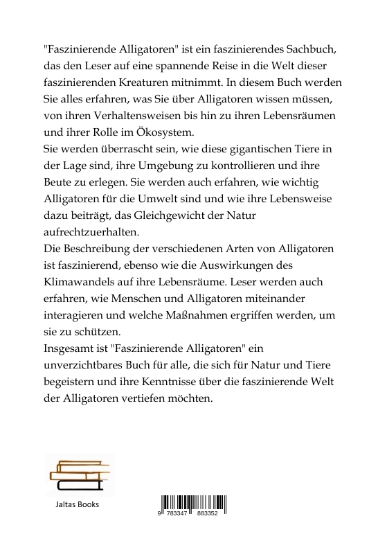 "Faszinierende Alligatoren" ist ein faszinierendes Sachbuch, das den Leser auf eine spannende Reise in die Welt dieser faszinierenden Kreaturen mitnimmt. In diesem Buch werden Sie alles erfahren, was Sie über Alligatoren wissen müssen, von ihren Verhaltensweisen bis hin zu ihren Lebensräumen und ihrer Rolle im Ökosystem.Sie werden überrascht sein, wie diese gigantischen Tiere in der Lage sind, ihre Umgebung zu kontrollieren und ihre Beute zu erlegen. Sie werden auch erfahren, wie wichtig Alligatoren für die Umwelt sind und wie ihre Lebensweise dazu beiträgt, das Gleichgewicht der Natur aufrechtzuerhalten.Die Beschreibung der verschiedenen Arten von Alligatoren ist faszinierend, ebenso wie die Auswirkungen des Klimawandels auf ihre Lebensräume. Leser werden auch erfahren, wie Menschen und Alligatoren miteinander interagieren und welche Maßnahmen ergriffen werden, um sie zu schützen.Insgesamt ist "Faszinierende Alligatoren" ein unverzichtbares Buch für alle, die sich für Natur und Tiere begeistern und ihre Kenntnisse über die faszinierende Welt der Alligatoren vertiefen möchten.