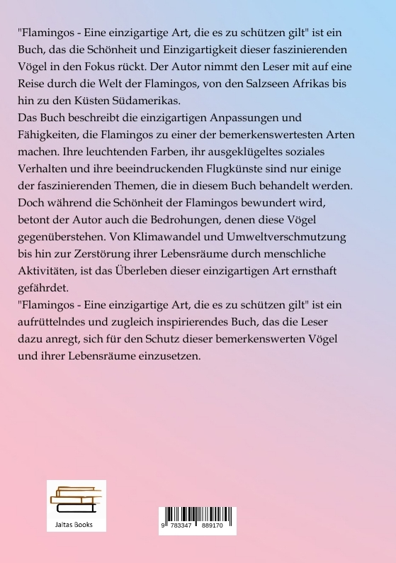 "Flamingos - Eine einzigartige Art, die es zu schützen gilt" ist ein Buch, das die Schönheit und Einzigartigkeit dieser faszinierenden Vögel in den Fokus rückt. Der Autor nimmt den Leser mit auf eine Reise durch die Welt der Flamingos, von den Salzseen Afrikas bis hin zu den Küsten Südamerikas.Das Buch beschreibt die einzigartigen Anpassungen und Fähigkeiten, die Flamingos zu einer der bemerkenswertesten Arten machen. Ihre leuchtenden Farben, ihr ausgeklügeltes soziales Verhalten und ihre beeindruckenden Flugkünste sind nur einige der faszinierenden Themen, die in diesem Buch behandelt werden.Doch während die Schönheit der Flamingos bewundert wird, betont der Autor auch die Bedrohungen, denen diese Vögel gegenüberstehen. Von Klimawandel und Umweltverschmutzung bis hin zur Zerstörung ihrer Lebensräume durch menschliche Aktivitäten, ist das Überleben dieser einzigartigen Art ernsthaft gefährdet."Flamingos - Eine einzigartige Art, die es zu schützen gilt" ist ein aufrüttelndes und zugleich inspirierendes Buch, das die Leser dazu anregt, sich für den Schutz dieser bemerkenswerten Vögel und ihrer Lebensräume einzusetzen.
