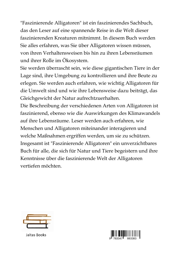 "Faszinierende Alligatoren" ist ein faszinierendes Sachbuch, das den Leser auf eine spannende Reise in die Welt dieser faszinierenden Kreaturen mitnimmt. In diesem Buch werden Sie alles erfahren, was Sie über Alligatoren wissen müssen, von ihren Verhaltensweisen bis hin zu ihren Lebensräumen und ihrer Rolle im Ökosystem.Sie werden überrascht sein, wie diese gigantischen Tiere in der Lage sind, ihre Umgebung zu kontrollieren und ihre Beute zu erlegen. Sie werden auch erfahren, wie wichtig Alligatoren für die Umwelt sind und wie ihre Lebensweise dazu beiträgt, das Gleichgewicht der Natur aufrechtzuerhalten.Die Beschreibung der verschiedenen Arten von Alligatoren ist faszinierend, ebenso wie die Auswirkungen des Klimawandels auf ihre Lebensräume. Leser werden auch erfahren, wie Menschen und Alligatoren miteinander interagieren und welche Maßnahmen ergriffen werden, um sie zu schützen.Insgesamt ist "Faszinierende Alligatoren" ein unverzichtbares Buch für alle, die sich für Natur und Tiere begeistern und ihre Kenntnisse über die faszinierende Welt der Alligatoren vertiefen möchten.