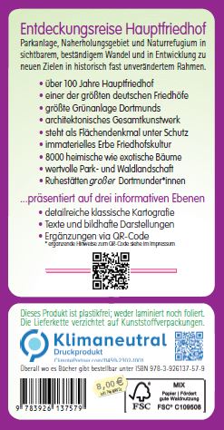 Das auf handliches Taschenformat gefalzte Kartenblatt mit Textteil bietet Übersicht und Informationen zur Natur, der Architektur und vielen Ruhestätten; es bietet eine Entdeckungsreise zum Hauptfriedhof Dortmund, einem der größten Friedhöfe Deutschlands. Dieser Parfriedhof, die größte Grünanlage der Stadt, ist ein mit dem ÖPNV bestens erschlossenes Naherholungsbegiet und Naturrefugium das zum "Immateriellen Erbe Friedhofskultur" der UNESCO zählt.