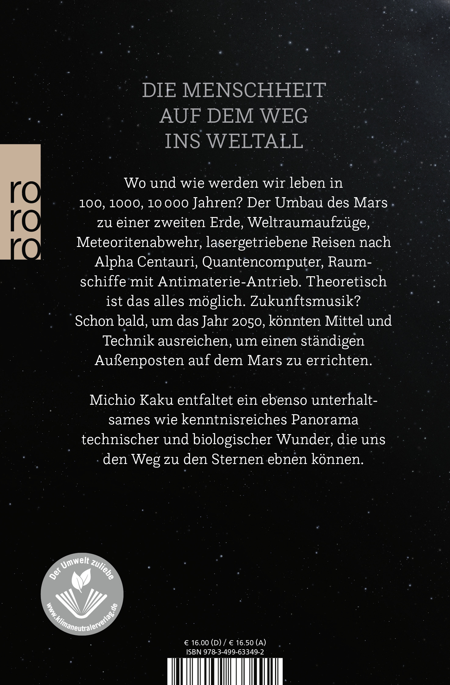 Unser Dasein auf diesem Planeten wird nicht ewig währen, einige Zehntausend Jahre noch - wenn es gut läuft. Höchste Zeit also, sich Gedanken über den Aufbruch ins Weltall zu machen. In diesem Buch erklärt der weltberühmte Physiker, wie und wann das gehen könnte. Die ersten Schritte führen zum Mars. Um das Jahr 2030 will die NASA eine bemannte Mission zum Roten Planeten schicken, in den nächsten Jahren schon mit der Erkundung des Asteroidengürtels zwischen Mars und Jupiter beginnen. Diese Himmelskörper geologisch auszubeuten, könnte die nächsten Schritte finanzieren: Terraforming mit sich selbst reproduzierenden Schürf- und Arbeitsroboter. Bereits um das Jahr 2050, schätzt Kaku, könnten Mittel und Technik ausreichen, um schon einmal einen ständigen Außenposten auf dem Mars zu errichten. Weiter geht die Entwicklung zu einer Stadt im Weltraum und zu Reisen in andere Sternensysteme. Michio Kaku diskutiert alle denkbarer Zukunftstechnologien, von Weltraumaufzügen bis zum Raumschiff mit Antimaterie-Antrieb. Er entfaltet ein so unterhaltsames wie kenntnisreiches Breitwand-Panorama künftiger technischer und biologischer Wunder, die uns den Weg ins Weltall ebnen können.