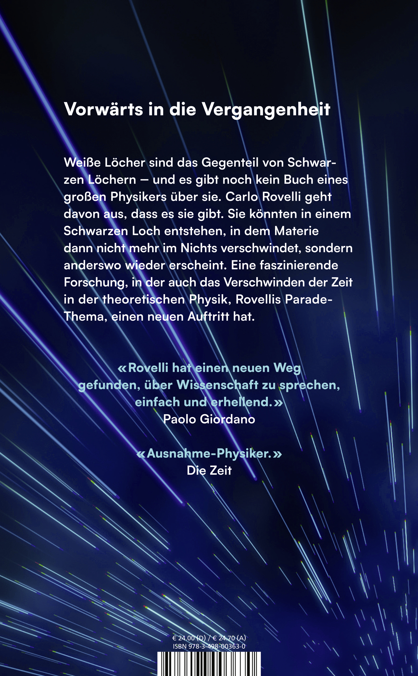| Schlagworte | Albert Einstein • Astrophysik • Die Ordnung der Zeit • Eine kurze Geschichte der Zeit • Entropie-Gesetze • Entstehung des Universums • Helgoland • Materie • Quantenphysik • Quantentheorie • Raum und Zeit • Schwarze Löcher • Stephen Hawking • Theoretische Physik • Weiße Löcher • Wurmlöcher |