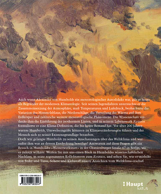 Wie Humboldts Vermessung der Welt den Grundstein für die moderne Klimaforschung legte.Einblicke in Humboldts Berliner Atelier und seinen Nachlass.Alexander von Humboldt - ein Mann der vielen Talente.Auch wenn Alexander von Humboldt ein meteorologischer Autodidakt war, gilt er heute als Begründer der modernen Klimatologie. Seit seinen Jugendjahren untersuchte er die Zusammensetzung der Atmosphäre, maß Temperaturen und den Luftdruck, beobachtete die Variation der Auch wenn Alexander von Humboldt ein meteorologischer Autodidakt war, gilt er heute als Begründer der modernen Klimatologie. Seit seinen Jugendjahren untersuchte er die Zusammensetzung der Atmosphäre, maß Temperaturen und den Luftdruck, beobachtete die Variation der Himmelsbläue, Niederschläge, die Verteilung der Wärme auf dem Erdkörper und zahlreiche weitere meteorologische Themen. Die Wissenschaft verdankt ihm die Einführung der isothermen Linien, und in seinem Lebenswerk Kosmos legte er eine Klimadefinition nieder, die bis heute Bestand hat. Vor mehr als 200 Jahren warnte Humboldt davor, dass Umwelteingriffe zu Klimaveränderungen führen können und der Mensch sich so seiner Existenzgrundlage beraubt.Doch wie gelangte Humboldt zu seinen Anschauungen über das Weltklima und wer außer ihm war an dessen Entdeckung beteiligt? Antworten auf diese Fragen gibt ein Besuch in Humboldts «Wetterwerkstatt» an der Oranienburger Straße 67 in Berlin. Werfen Sie mit den Autoren einen Blick in seinen wissenschaftlichen Nachlass, seine Kollektaneen zum Kosmos, und sehen Sie, wie er mithilfe von Feder und Tinte, Schere und Klebstoff unsere Ansichten vom Weltklima erschuf.