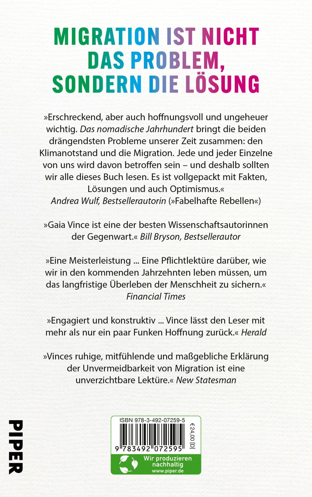 „Erschreckend, aber auch hoffnungsvoll und ungeheuer wichtig. Das nomadische Jahrhundert bringt die beiden drängendsten Probleme unserer Zeit zusammen: den Klimanotstand und die Migration. Jede und jeder Einzelne von uns wird davon betroffen sein – und deshalb sollten wir alle dieses Buch lesen. Es ist vollgepackt mit Fakten, Lösungen und auch Optimismus.“