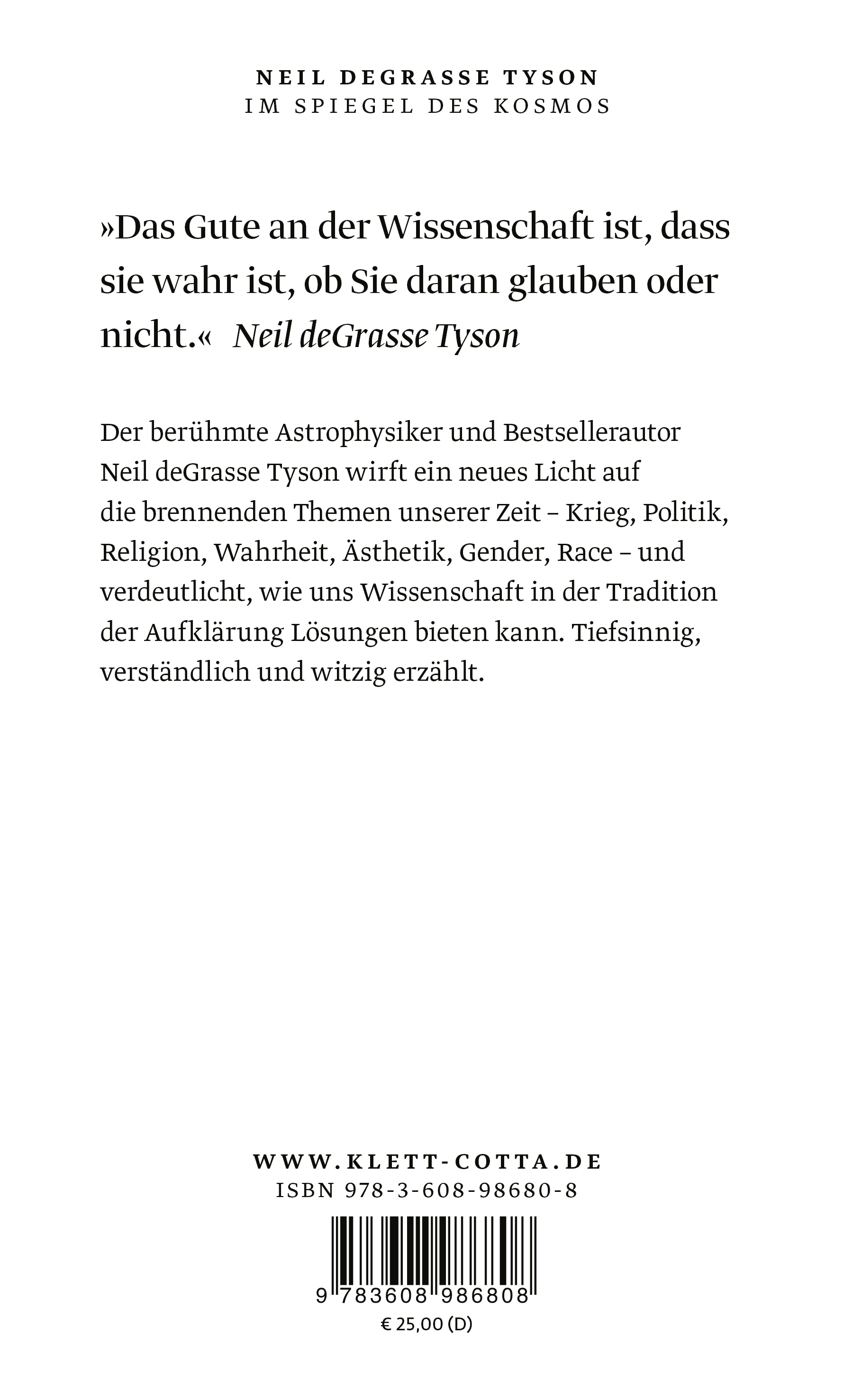 Der berühmte Astrophysiker und Bestsellerautor Neil deGrasse Tyson wirft ein neues Licht auf die brennenden Themen unserer Zeit - Krieg, Politik, Religion, Wahrheit, Ästhetik, Gender, Race - und verdeutlicht, wie uns Wissenschaft in der Tradition der Aufklärung Lösungen bieten kann. So tiefsinnig, verständlich und witzig wurde Kosmologie seit Stephen Hawking nicht mehr erzählt.