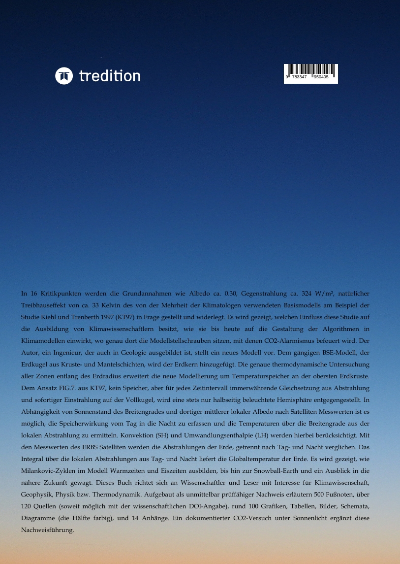 Als konstruktiver Bauingenieur des Hoch- und Tiefbaus (Stahlbau, Holzbau, Stahlbeton, Spannbeton, Brückenbau, etc., mit universitärer Ausbildung u.a. in Mathematik, Informatik, Physik, Statik, technischer Mechanik, Geologie, Hydraulik, Hydrologie, Wasserbau, Straßen- und Eisenbahnbau, Bodenmechanik, Felsmechanik, Geophysik und Baurecht) habe ich viele Jahre als Statiker und auch als Prüfstatiker gearbeitet. Mit der eigenen Unterschrift, der direkten juristischen Haftung für Freigabe der Ausführung, übernimmt man die persönliche Verantwortung. Als Prüfstatiker wird man in der Regel vereidigt, um unbestechlich, ohne Ansehen der Person oder Institution zu prüfen. Es ist die Aufgabe letztverantwortlich Fehler zu finden und zu korrigieren zum Schutz für Leib und Leben der Menschen. Hierbei prüft man auch Algorithmen der Software, bzw. die Software selbst. Heute bin ich in einem anderen Bereich des Bauwesens tätig. In der Statik wurden immer leistungsfähigere räumliche Berechnungsverfahren (Netze bzw. Finite Elemente) bereits Ende Mitte der 1980er Jahre entwickelt. Die Software der Klimamodelle verwendet ebenfalls räumliche Netze (Grids). Sie sind etwas anders aufgebaut, mit anderen Differenzialgleichungen bestückt und gehorchen anderen Randbedingungen als die Netze, die Bauwerke modellieren. Aus rein privatem Interesse begann ich vor vielen Jahren - als die Treibhaushypothese noch nicht im öffentlichen Interesse stand - mich mit dieser auseinander zusetzten. A priori ging ich davon aus, der sogenannte "Treibhauseffekt " sei selbstverständlich richtig . Klimawissenschaftler haften juristisch weder für Ihre Modelle noch für die volkswirtschaftlichen Auswirkungen ihrer Berechnungen. In den gängigen Klimamodellen wird der THE benötigt, um die Temperaturbildung zu durchzuführen. Es tauchten beim THE für mich Ungereimtheiten, Widerspruche und Fehler in seiner Ableitung auf. Über 900 Studien arbeitete ich über die Jahre zum Thema Modellierung-Klima-THE durch und, was zu diesem Bereich hinzutritt, privat, aber in der Herangehensweise eines Prüfingenieurs. Im Ergebnis gibt es mit meiner in von einander unabhängigen Beweisketten begründeter Beweisführung den THE real nicht. Die Temperaturbildung gehorcht andern Gesetzmäßigkeiten. Diese zeige ich explizit auf. Mit den umfangreichen Erweiterungen im Modell wurde der alte Titel der gelben 2. Auflage, 2021, "Kritische Analyse zur globalen Klimatheorie" durch einen Neuen ersetzt.
