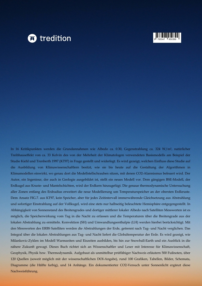 Als konstruktiver Bauingenieur des Hoch- und Tiefbaus (Stahlbau, Holzbau, Stahlbeton, Spannbeton, Brückenbau, etc., mit universitärer Ausbildung u.a. in Mathematik, Informatik, Physik, Statik, technischer Mechanik, Geologie, Hydraulik, Hydrologie, Wasserbau, Straßen- und Eisenbahnbau, Bodenmechanik, Felsmechanik, Geophysik und Baurecht) habe ich viele Jahre als Statiker und auch als Prüfstatiker gearbeitet. Mit der eigenen Unterschrift, der direkten juristischen Haftung für Freigabe der Ausführung, übernimmt man die persönliche Verantwortung. Als Prüfstatiker wird man in der Regel vereidigt, um unbestechlich, ohne Ansehen der Person oder Institution zu prüfen. Es ist die Aufgabe letztverantwortlich Fehler zu finden und zu korrigieren zum Schutz für Leib und Leben der Menschen. Hierbei prüft man auch Algorithmen der Software, bzw. die Software selbst. Heute bin ich in einem anderen Bereich des Bauwesens tätig. In der Statik wurden immer leistungsfähigere räumliche Berechnungsverfahren (Netze bzw. Finite Elemente) bereits Ende Mitte der 1980er Jahre entwickelt. Die Software der Klimamodelle verwendet ebenfalls räumliche Netze (Grids). Sie sind etwas anders aufgebaut, mit anderen Differenzialgleichungen bestückt und gehorchen anderen Randbedingungen als die Netze, die Bauwerke modellieren. Aus rein privatem Interesse begann ich vor vielen Jahren - als die Treibhaushypothese noch nicht im öffentlichen Interesse stand - mich mit dieser auseinander zusetzten. A priori ging ich davon aus, der sogenannte "Treibhauseffekt " sei selbstverständlich richtig . Klimawissenschaftler haften juristisch weder für Ihre Modelle noch für die volkswirtschaftlichen Auswirkungen ihrer Berechnungen. In den gängigen Klimamodellen wird der THE benötigt, um die Temperaturbildung zu durchzuführen. Es tauchten beim THE für mich Ungereimtheiten, Widerspruche und Fehler in seiner Ableitung auf. Über 900 Studien arbeitete ich über die Jahre zum Thema Modellierung-Klima-THE durch und, was zu diesem Bereich hinzutritt, privat, aber in der Herangehensweise eines Prüfingenieurs. Im Ergebnis gibt es mit meiner in von einander unabhängigen Beweisketten begründeter Beweisführung den THE real nicht. Die Temperaturbildung gehorcht andern Gesetzmäßigkeiten. Diese zeige ich explizit auf. Mit den umfangreichen Erweiterungen im Modell wurde der alte Titel der gelben 2. Auflage, 2021, "Kritische Analyse zur globalen Klimatheorie" durch einen Neuen ersetzt.