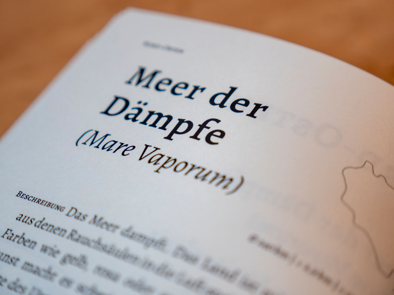 Mit seiner aufwendigen Gestaltung - darunter verschiedene Papiersorten , handeingehängte Bilder und eine durchdachte Typografie - erinnert das Werk an einen illustrierten Mond-Atlas .