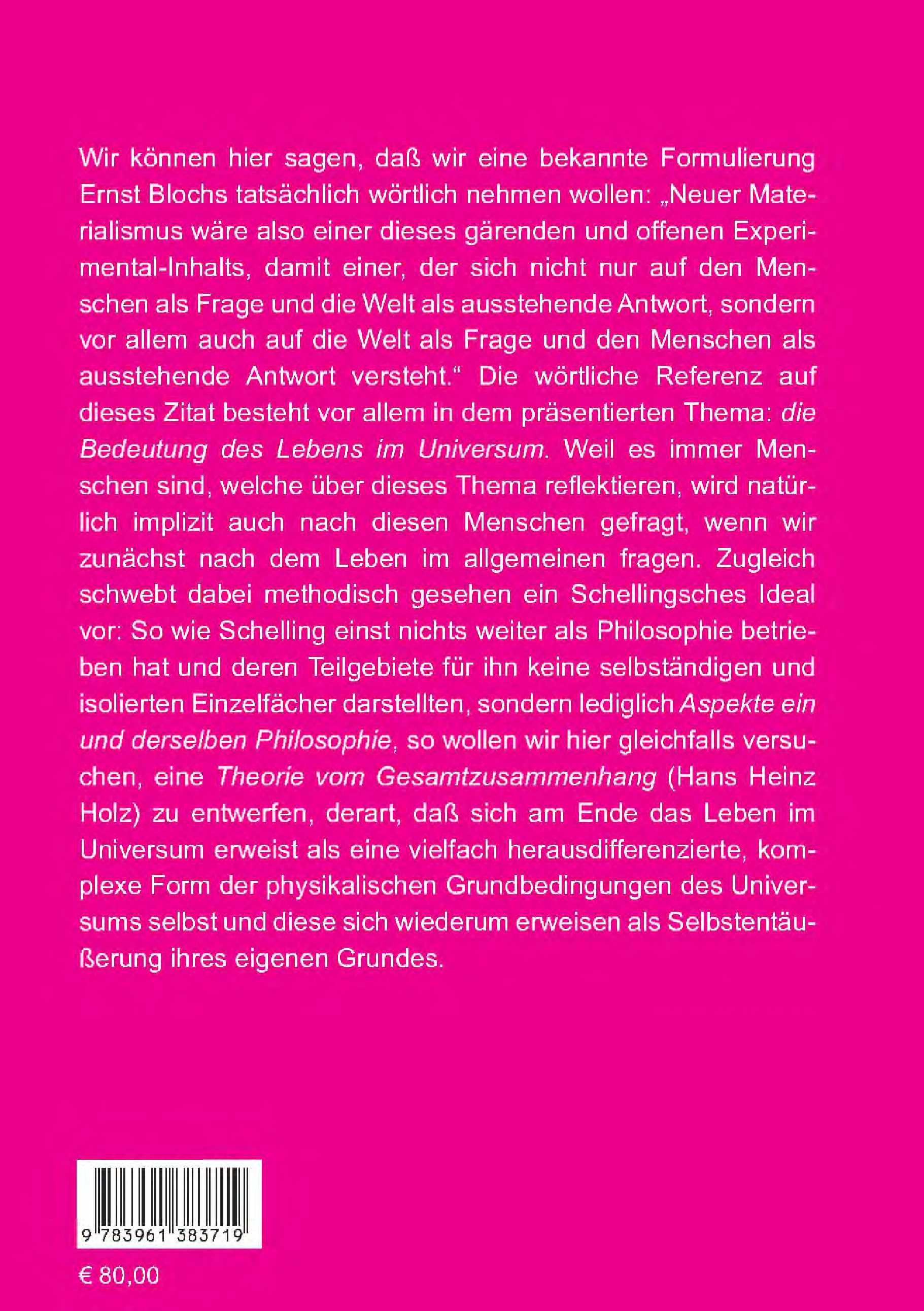 Wir können hier sagen, daß wir eine bekannte Formulierung Ernst Blochs tatsächlich wörtlich nehmen wollen: „Neuer Materialismus wäre also einer dieses gärenden und offenen Experimental-Inhalts, damit einer, der sich nicht nur auf den Menschen als Frage und die Welt als ausstehende Antwort, sondern vor allem auch auf die Welt als Frage und den Menschen als ausstehende Antwort versteht.“ Die wörtliche Referenz auf dieses Zitat besteht vor allem in dem präsentierten Thema: die Bedeutung des Lebens im Universum. Weil es immer Menschen sind, welche über dieses Thema reflektieren, wird natürlich implizit auch nach diesen Menschen gefragt, wenn wir zunächst nach dem Leben im allgemeinen fragen. Zugleich schwebt dabei methodisch gesehen ein Schellingsches Ideal vor: So wie Schelling einst nichts weiter als Philosophie betrieben hat und deren Teilgebiete für ihn keine selbständigen und isolierten Einzelfächer darstellten, sondern lediglich Aspekte ein und derselben Philosophie, so wollen wir hier gleichfalls versuchen, eine Theorie vom Gesamtzusammenhang (Hans Heinz Holz) zu entwerfen, derart, daß sich am Ende das Leben im Universum erweist als eine vielfach herausdifferenzierte, komplexe Form der physikalischen Grundbedingungen des Universums selbst und diese sich wiederum erweisen als Selbstentäußerung ihres eigenen Grundes.