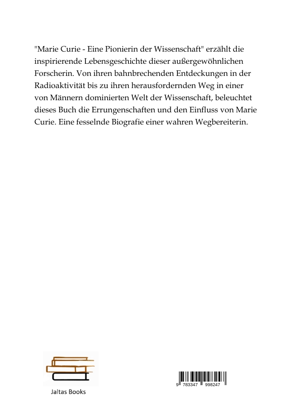"Marie Curie - Eine Pionierin der Wissenschaft" erzählt die inspirierende Lebensgeschichte dieser außergewöhnlichen Forscherin. Von ihren bahnbrechenden Entdeckungen in der Radioaktivität bis zu ihren herausfordernden Weg in einer von Männern dominierten Welt der Wissenschaft, beleuchtet dieses Buch die Errungenschaften und den Einfluss von Marie Curie. Eine fesselnde Biografie einer wahren Wegbereiterin.