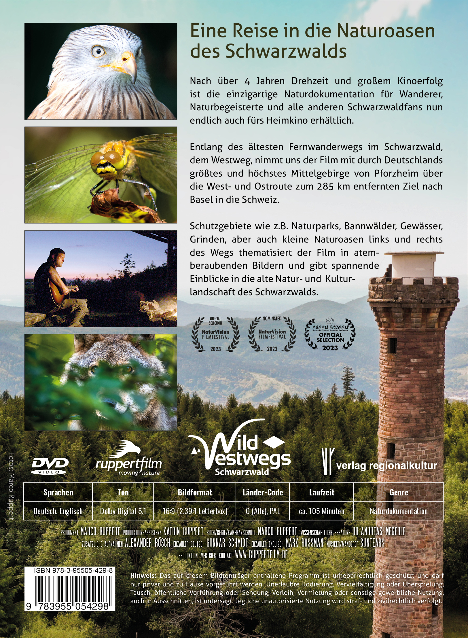Eine Reise in die Naturoasen des SchwarzwaldsNach über 4 Jahren Drehzeit und großem Kinoerfolg ist die einzigartige Naturdokumentation für Wanderer, Naturbegeisterte und alle anderen Schwarzwaldfans nun endlich auch fürs Heimkino erhältlich.Entlang des ältesten Fernwanderwegs im Schwarzwald, dem Westweg, nimmt uns der Film mit durch Deutschlands größtes und höchstes Mittelgebirge von Pforzheim über die West- und Ostroute zum 285 km entfernten Ziel nach Basel in die Schweiz.Schutzgebiete wie z.B. Naturparks, Bannwälder, Gewässer, Grinden, aber auch kleine Naturoasen links und rechts des Wegs thematisiert der Film in atemberaubenden Bildern und gibt spannende Einblicke in die alte Natur- und Kulturlandschaft des Schwarzwalds.