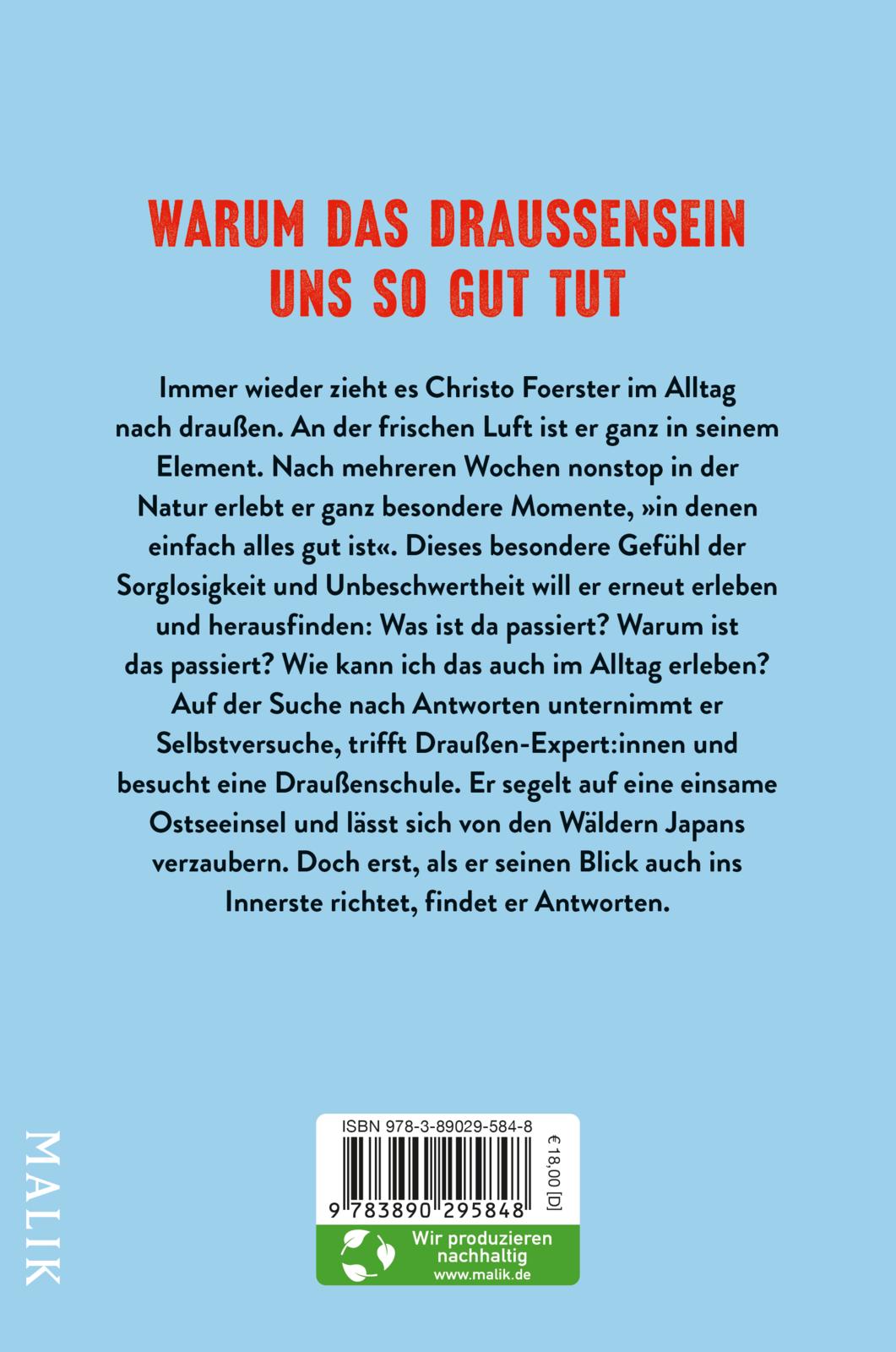 Warum das Draußensein uns so gut tut: Auf einer langen Outdoor-Reise erlebt Christo Foerster Momente, »in denen einfach alles gut ist«. Dieses Gefühl der Sorglosigkeit und Unbeschwertheit will er erneut erleben, ohne sich auf eine wochenlange Reise begeben zu müssen. Er will herausfinden: Was ist passiert? Warum ist das passiert? Wie kann ich das auch im Alltag erleben? Dafür unternimmt er Selbstversuche und spricht mit vielen Expert:innen. Er erklärt wissenschaftliche Erkenntnisse zu den Themen Stress, menschliche Entwicklungsgeschichte, natürliche Duftstoffe in der Medizin und Erkältungen, die drinnen entstehen, nicht draußen.