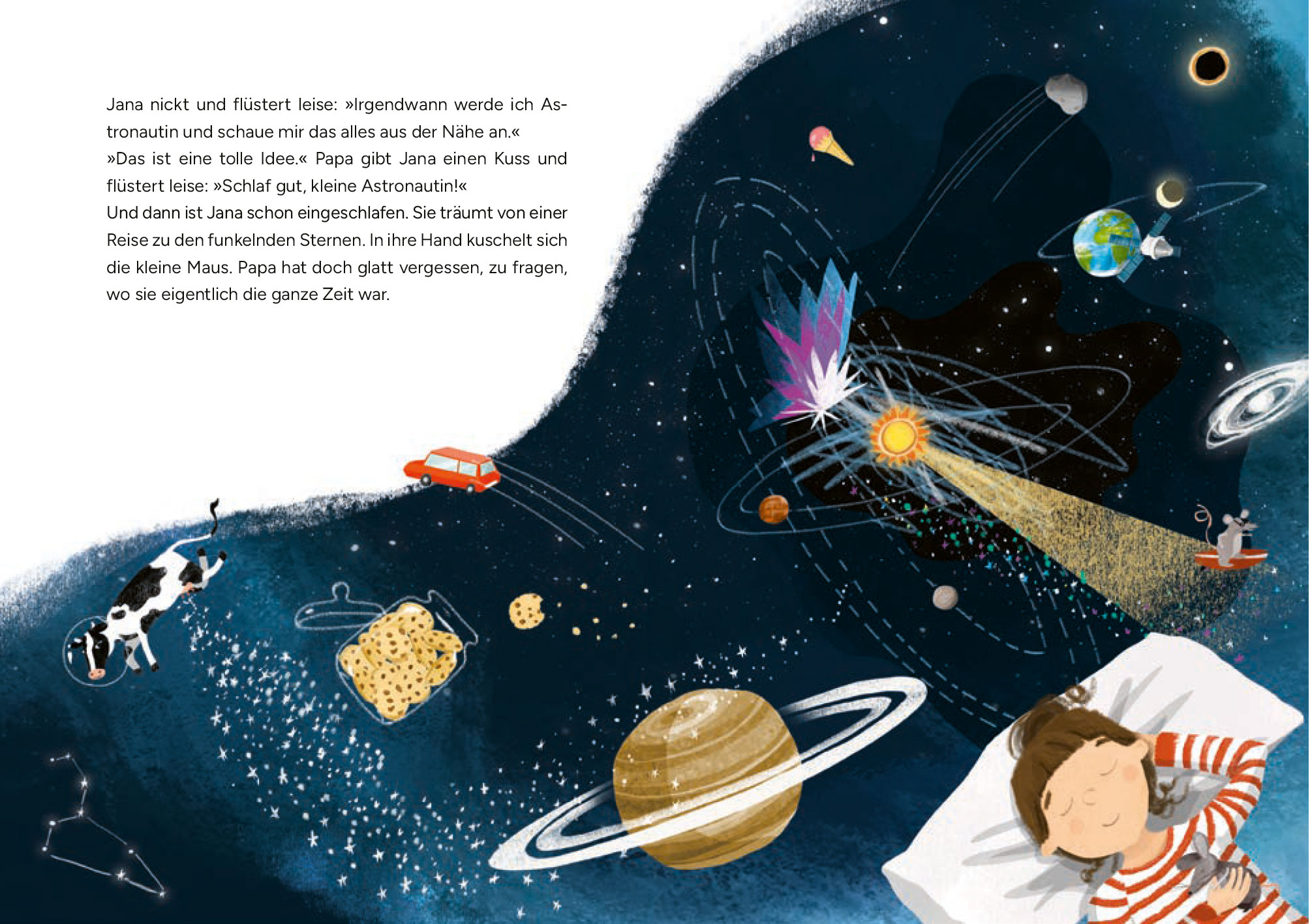 »Papa, wie groß ist eigentlich der Himmel?«, ist eine von Janas großen Abendfragen. Angesichts des Sternenhimmels fühlt sie sich klein wie ein Kekskrümel. Zum Glück ist ihr Papa Astrophysiker und begegnet Janas Neugierde mit leicht verständlichen und zugleich faszinierenden Antworten. Gemeinsam machen sie eine Reise durch das Universum. Und Jana fragt immer weiter: Wie entsteht ein Stern? Was ist ein schwarzes Loch? Und was ist hinter unserer Milchstraße? Mit Janas Taschenlampe schicken die beiden Lichtbotschaften in den Himmel. Nach einem Herzschlag schon ist das Blinken auf dem Mond zu sehen! Ob die Oma ihres besten Freundes den Lichtgruß auch sehen kann?, fragt sich Jana am Tag nach deren Beerdigung. Vielleicht. Alles weiß Janas Papa eben auch nicht.
