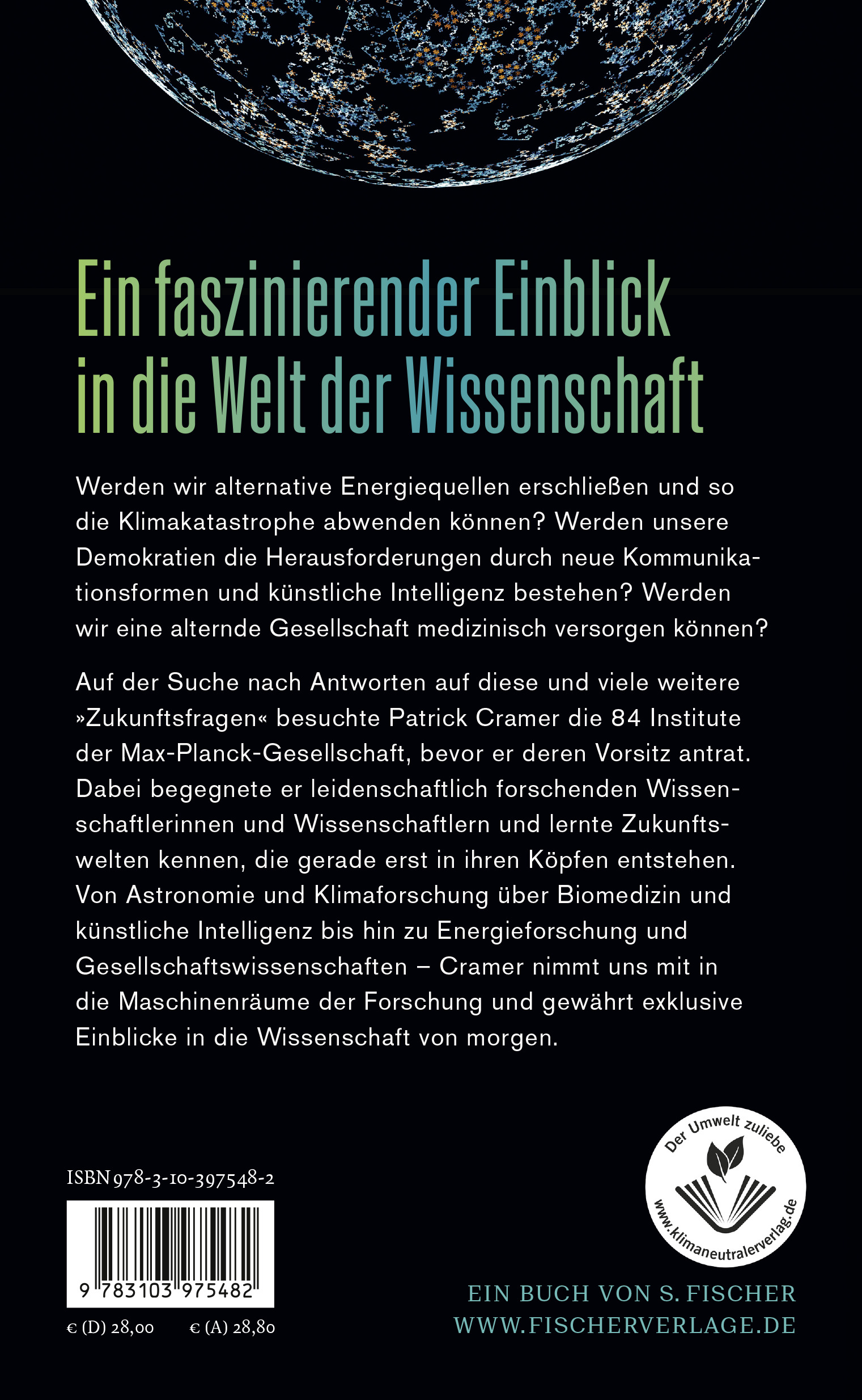 Auf der Suche nach Antworten auf diese und viele weitere »Zukunftsfragen« besuchte Patrick Cramer die 84 Institute der Max-Planck-Gesellschaft, bevor er deren Vorsitz antrat. Dabei begegnete er leidenschaftlich forschenden Wissenschaftlerinnen und Wissenschaftlern und lernte Zukunftswelten kennen, die gerade erst in ihren Köpfen entstehen. Von Astronomie und Klimaforschung über Biomedizin und künstliche Intelligenz bis hin zu Energieforschung und Gesellschaftswissenschaften – Cramer nimmt uns mit in die Maschinenräume der Forschung und gewährt exklusive Einblicke in die Wissenschaft von morgen.