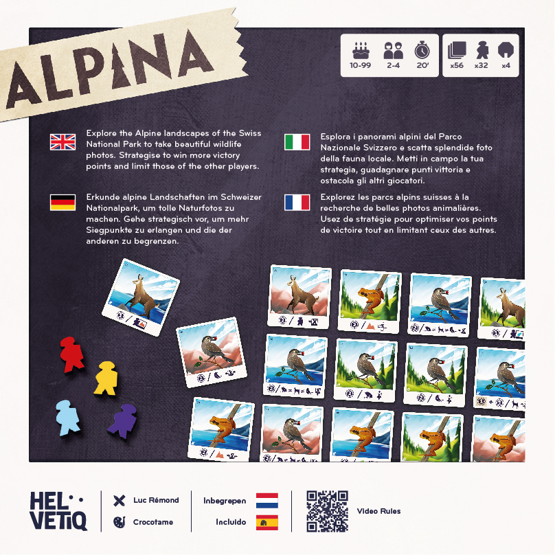 Alpina ist ein Strategiespiel mit einfachen Regeln. Spielt ihr eine Karte, um mehr Punkte zu sammeln, oder nutzt ihr die Gelegenheit, um eure Gegner hinters Licht zu führen? Findet die Karte, die es euch ermöglicht, zwischen diesen beiden Zielsetzungen eine Balance zu finden, und der Sieg wird euch gehören!