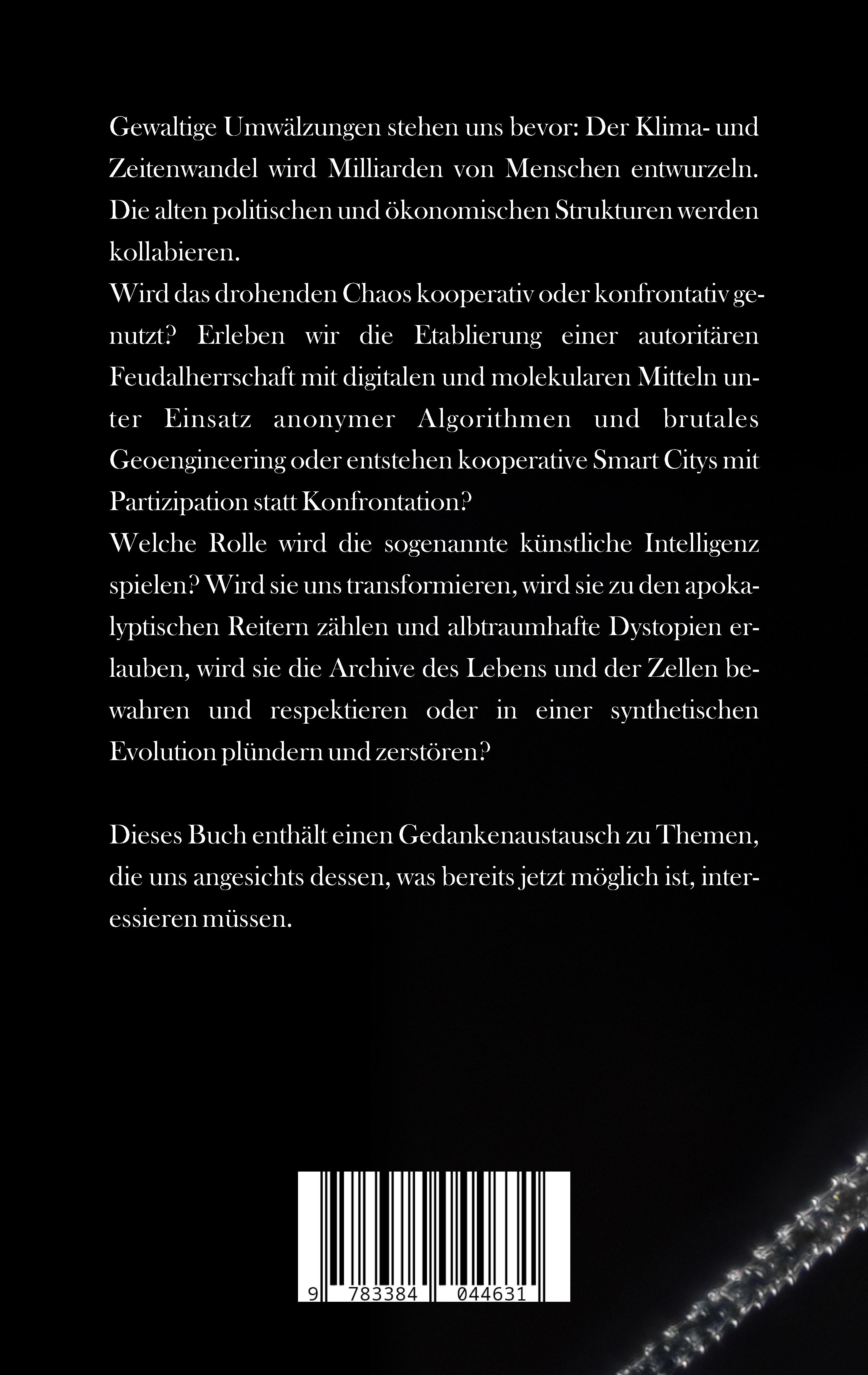 Gewaltige Umwälzungen stehen uns bevor: Der Klima- und Zeitenwandel wird Milliarden von Menschen entwurzeln. Die alten politischen und ökonomischen Strukturen werden kollabieren. Wird das drohenden Chaos kooperativ oder konfrontativ genutzt? Erleben wir die Etablierung einer autoritären Feudalherrschaft mit digitalen und molekularen Mitteln unter Einsatz anonymer Algorithmen und brutales Geoengineering oder entstehen kooperative Smart Citys mit Partizipation statt Konfrontation? Welche Rolle wird die sogenannte künstliche Intelligenz spielen? Wird sie uns transformieren, wird sie zu den apokalyptischen Reitern zählen und albtraumhafte Dystopien erlauben, wird sie die Archive des Lebens und der Zellen bewahren und respektieren oder in einer synthetischen Evolution plündern und zerstören? Dieses Buch enthält einen Gedankenaustausch zu Themen, die uns angesichts dessen, was bereits jetzt möglich ist, interessieren müssen.