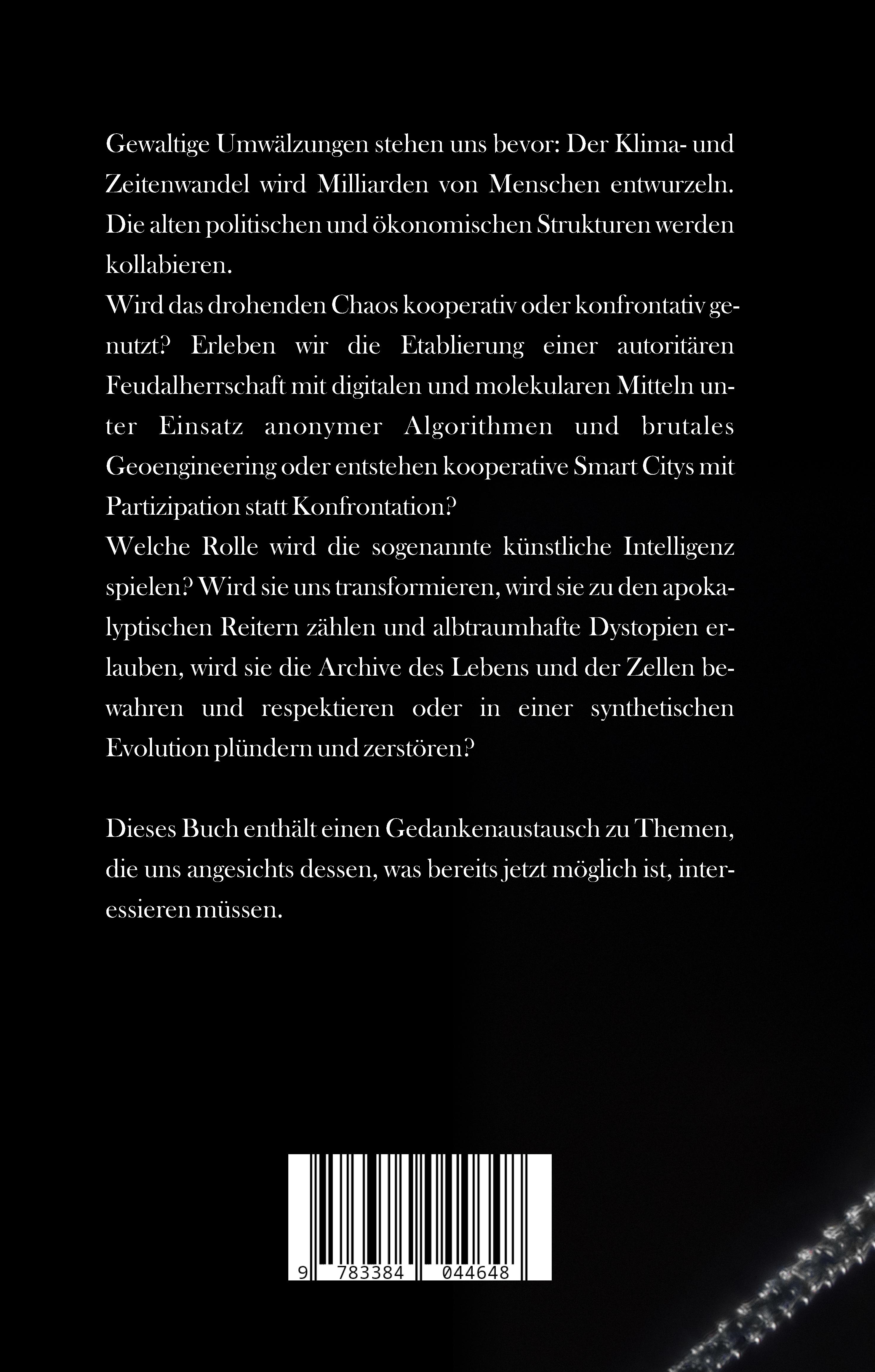 Gewaltige Umwälzungen stehen uns bevor: Der Klima- und Zeitenwandel wird Milliarden von Menschen entwurzeln. Die alten politischen und ökonomischen Strukturen werden kollabieren. Wird das drohenden Chaos kooperativ oder konfrontativ genutzt? Erleben wir die Etablierung einer autoritären Feudalherrschaft mit digitalen und molekularen Mitteln unter Einsatz anonymer Algorithmen und brutales Geoengineering oder entstehen kooperative Smart Citys mit Partizipation statt Konfrontation? Welche Rolle wird die sogenannte künstliche Intelligenz spielen? Wird sie uns transformieren, wird sie zu den apokalyptischen Reitern zählen und albtraumhafte Dystopien erlauben, wird sie die Archive des Lebens und der Zellen bewahren und respektieren oder in einer synthetischen Evolution plündern und zerstören? Dieses Buch enthält einen Gedankenaustausch zu Themen, die uns angesichts dessen, was bereits jetzt möglich ist, interessieren müssen.