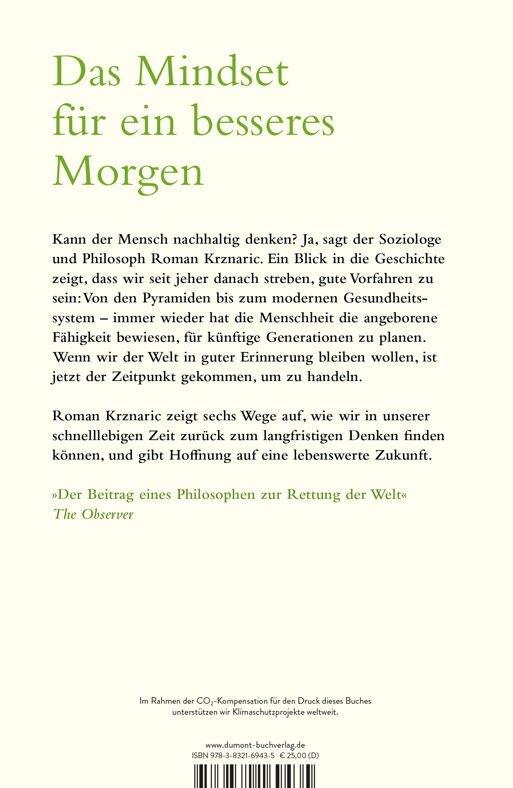 »Unaufgeregt und ermutigend« Caroline Ring, P.M. MAGAZIN »Roman Krznaric schöpft Hoffnung im Gestern und Heute« Petra Wiemann, BILD DER WISSENSCHAFT »Wir machen zurzeit multiple Krisen durch. Untergangsstimmung breitet sich aus. Doch Roman Krznaric schöpft Hoffnung aus Geschichte und Gegenwart.« Petra Wiemann, NATUR »'Der gute Vorfahr' ist gut lesbar und verständlich geschrieben. Der Autor illustriert seine Thesen immer wieder über Alltagserfahrungen und vermittelt dabei Hintergründe aus Geschichte, Soziologie, Ökonomie und Politik. Schnell entsteht so beim Lesen die Frage, wie man selbst zu den nötigen Veränderungen beitragen kann.« Fenja De Silva-Schmidt, SPEKTRUM ONLINE