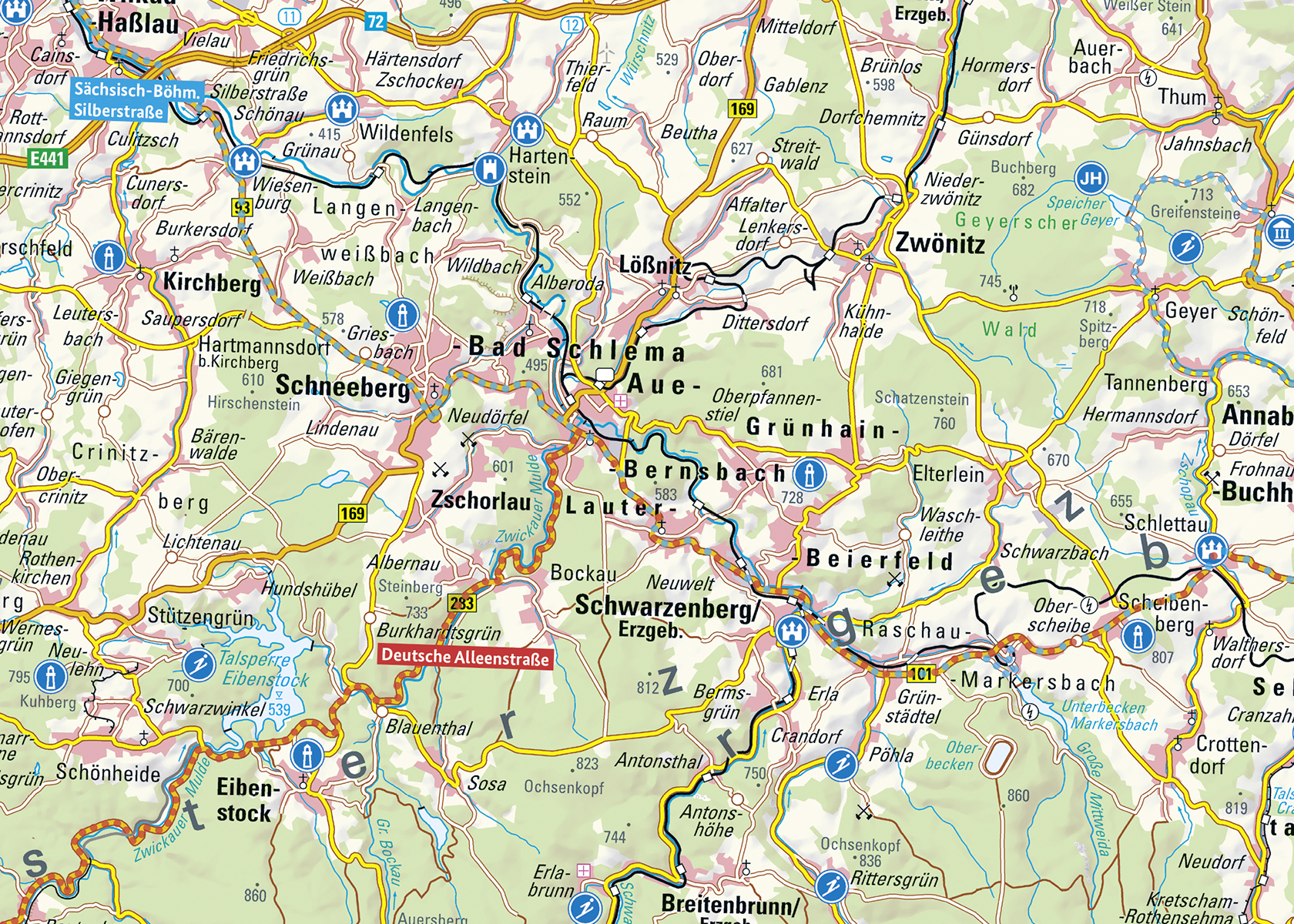 Wandkarte auf Hochglanzpapier mit Aufhänger und Metall-Bestäbung. Maßstab 1:200.000. Kartengröße ca. 115 cm x 98 cm (Breite x Höhe) Die Karte bildet unter anderem Verkehrswege (Schienenverkehr, Autobahnen, Bundes- und Europastrassen mit Strassennummer), administrative Grenzen (Staats- und Landesgrenzen), geographische Namen (Orte, Gewässer, Berge, Landschaften, Länder), Signaturen für Flughafen, Windkraftanlagen, UNESCO-Stätten, Ferienstraßen, Höhlen, Zoos, Burgen, Aussichtstürme, Schlösser, Freizeit- und Wildparks ab.Die Karte ist auch ohne Aufhänger und ohne Metall-Bestäbung mit der ISBN 978-3-86482-148-6 erhältlich.