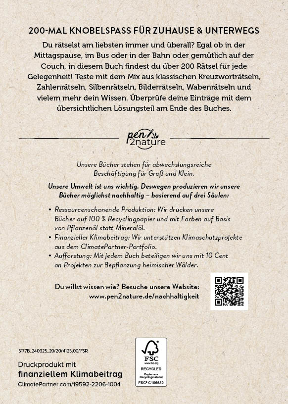 | Schlagworte | aus Recyclingpapier • Bilderrätsel • Buch • Bücher • gemischte Rätsel • Geschenk • Geschenkbuch • Geschenk für Rätselfans • Klimaneutrales Buch • klimapositiv • Kreuzworträtsel • nachhaltiges Geschenk Buch • ökologische Bücher • p2n • pen 2 nature • pen2nature • pen to nature • Pflanzenfarben • Rätsel • Rätselbuch • Rätsel-Mix • Schwedenrätsel • Silbenrätsel • umweltbewusst • umweltfreundliche Bücher • Umweltverlag • Wabenrätsel • Zahlenrätsel • Zero Waste |