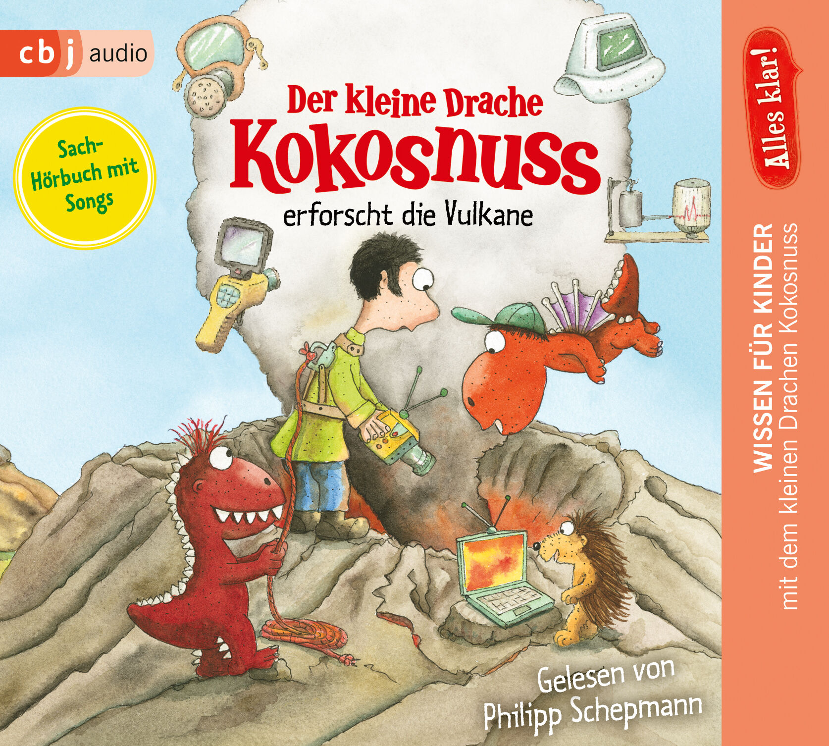 Von ihrem Baumhaus aus beobachten Kokosnuss, Oskar und Matilda, dass der »Gugelhupf«, der Vulkan der Dracheninsel, verstärkt Asche und Gesteinsbrocken spuckt. Gut, dass die Vulkanologin Dotti vom Planeten Öxi gerade zu Besuch ist und den Freunden Fragen beantworten kann: Was passiert bei einem Vulkanausbruch und welche Arten von Vulkanen gibt es? Was ist der Unterschied zwischen Magma und Lava? Was ist 79 n. Chr. in Pompeji passiert? Und können Vulkane auch neues Leben schaffen?Für die kleinen Hörerinnen und Hörer sammelt Matilda die Antworten auf diese Fragen und viele anschauliche Bilder in ihrem »Notizbuch«, dem Booklet. Vielstimmig gelesen von Philipp Schepmann. Mit tollen Lernsongs zum Mitsingen!