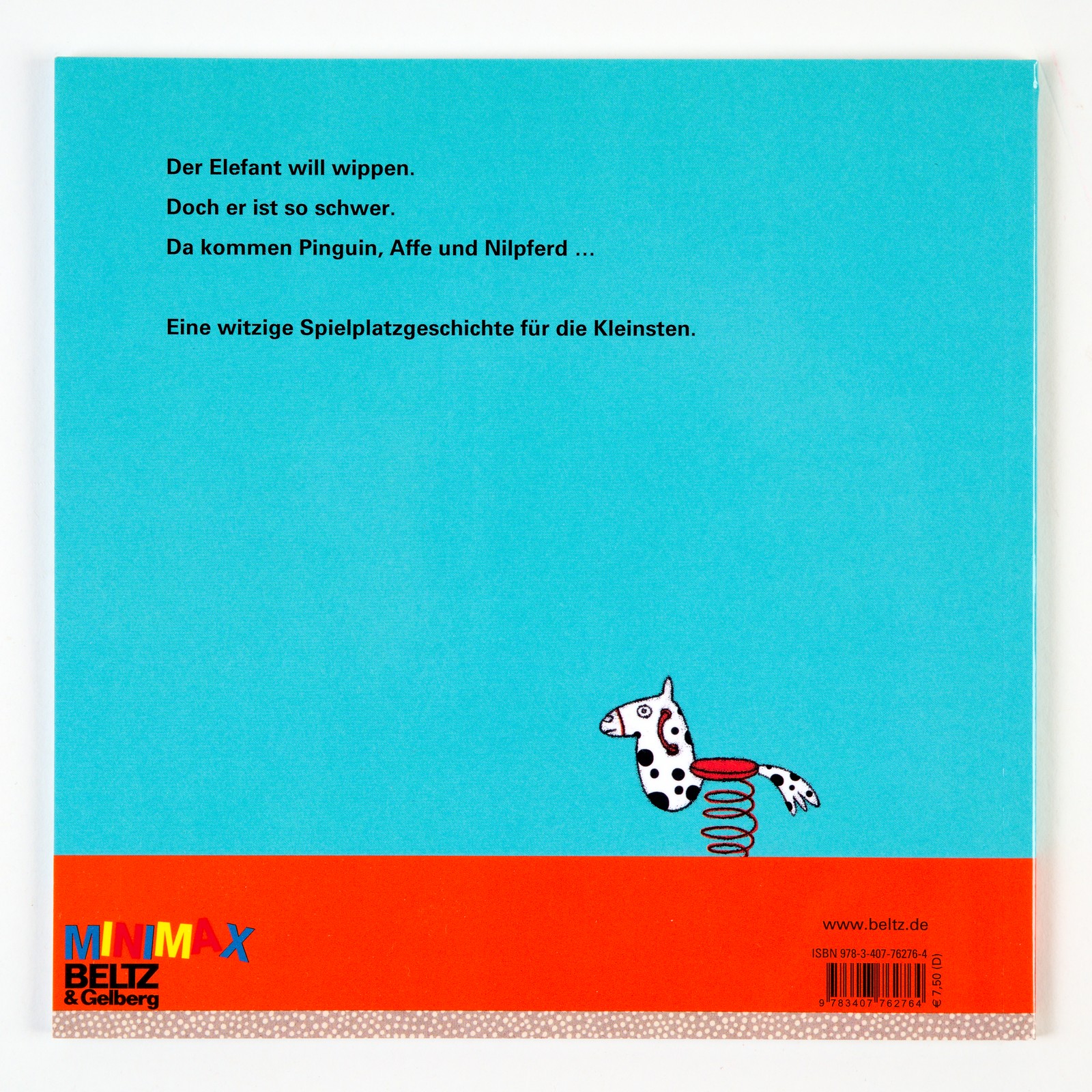 Mit lautmalerischer Sprache und klaren Illustrationen erzählt dieses Bilderbuch von der Königsdisziplin auf dem Spielplatz: Der Wippe. Da sitzt der Elefant auf der einen Seite und es wird schnell klar, dass es eine ganze Menagerie relativer Leichtgewichte für das Auf und Ab brauchen wird. Ein lustiges Spiel, das erstes physikalisches Verständnis vermittelt und mit einem überraschenden Ende glänzt.