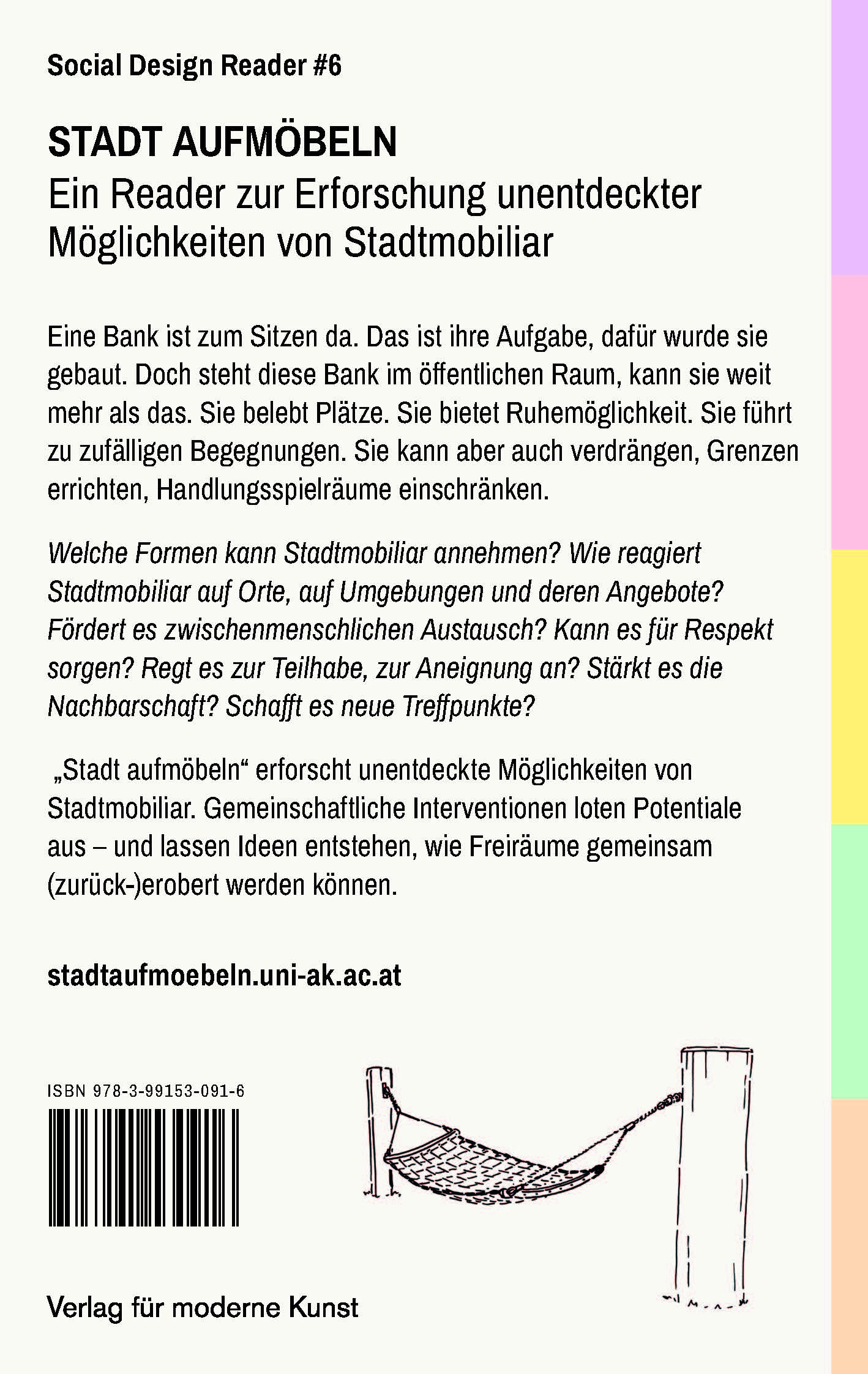 Ein Reader zur Erforschung unentdeckter Möglichkeiten von StadtmobiliarEine Bank ist zum Sitzen da. Das ist ihre Aufgabe, dafür wurde sie gebaut. Doch steht diese Bank im öffentlichen Raum, kann sie weit mehr als das. Sie belebt Plätze. Sie bietet Ruhemöglichkeit. Sie führt zu zufälligen Begegnungen. Sie kann aber auch verdrängen, Grenzen errichten, Handlungsspielräume einschränken.Welche Formen kann Stadtmobiliar annehmen? Wie reagiert Stadtmobiliar auf Orte, auf Umgebungen und deren Angebote?Fördert es zwischenmenschlichen Austausch? Kann es für Respekt sorgen? Regt es zur Teilhabe, zur Aneignung an? Stärkt es die Nachbarschaft? Schafft es neue Treffpunkte?"Stadt aufmöbeln" erforscht unentdeckte Möglichkeiten von Stadtmobiliar. Gemeinschaftliche Interventionen loten Potentiale aus - und lassen Ideen entstehen, wie Freiräume gemeinsam (zurück-)erobert werden können.