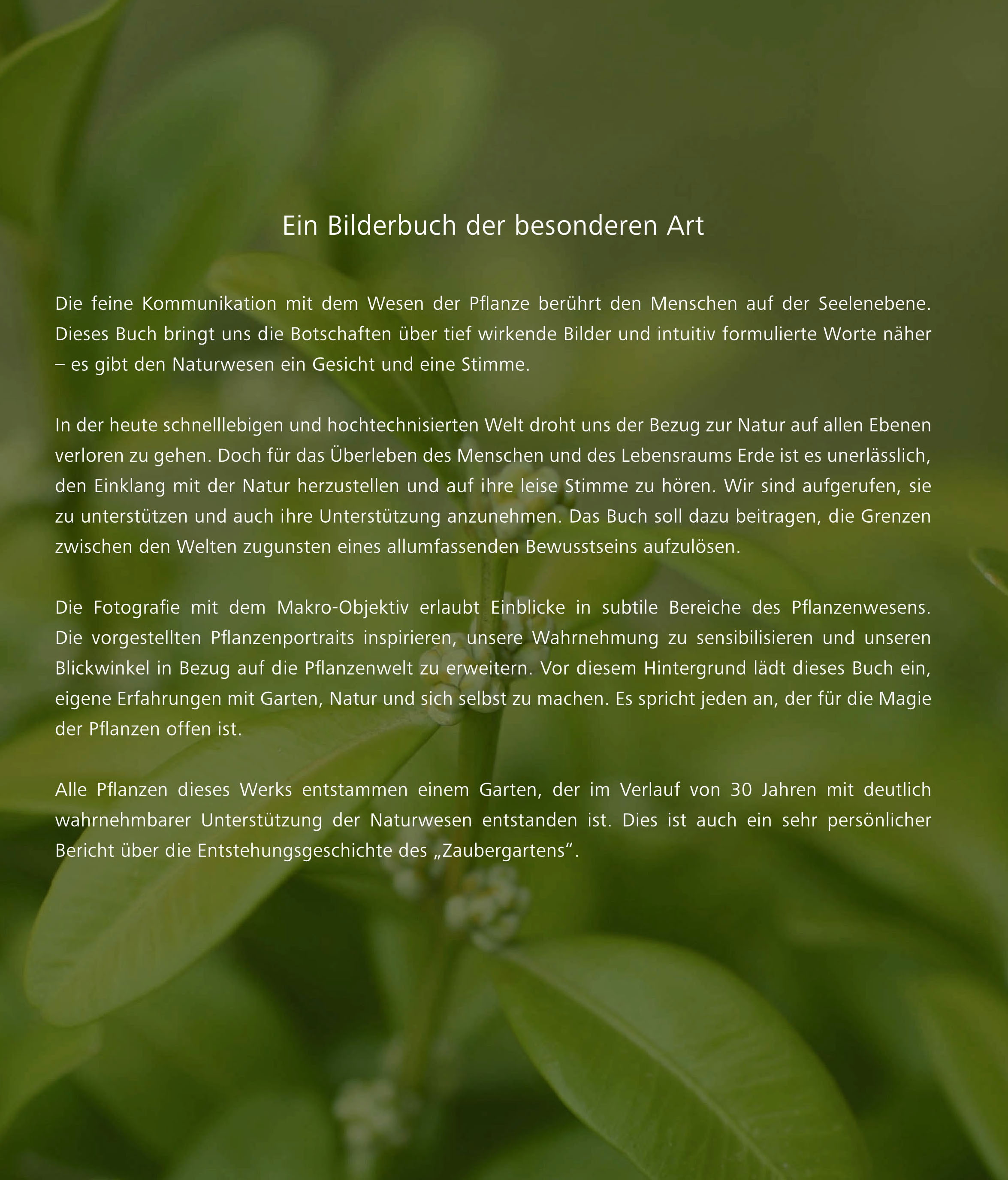 Ein exklusiver Bildband der die berührenden Informationen, die der Autor im Kontakt mit den Pflanzen erfahren durfte, in Wort und Fotografie dokumentiert. Er beschreibt auch die Entstehungsgeschichte eines außergewöhnlichen Gartens. Jeder Pflanze wird eine Doppelseite mit einem detaillierten Foto und einer Beschreibung ihrer Wirkung gewidmet.In der heute oft so schnelllebigen Welt wird es immer wichtiger den Einklang mit der Natur wieder herzustellen und auf ihre leise Stimme zu hören. Dieses Buch soll dazu beitragen, die Grenzen zwischen den Welten zugunsten eines allumfassenden Bewusstseins aufzulösen.Dies gelingt dem Autor in dem er uns durch sein Makro-Objektiv in seinen Zaubergarten sehen lässt. Die vorgestellten Pflanzenportraits inspirieren unsere Wahrnehmung zu sensibilisieren und unseren Blickwinkel in Bezug auf die Pflanzenwelt zu erweitern. Es spricht jeden an, der für die Magie der Natur offen ist. Alle Pflanzen dieses Werks entstammen einem Garten, der im Verlauf von 30 Jahren mit deutlich wahrnehmbarer Unterstützung der Naturwesen und vielen lieben Menschen entstanden ist.