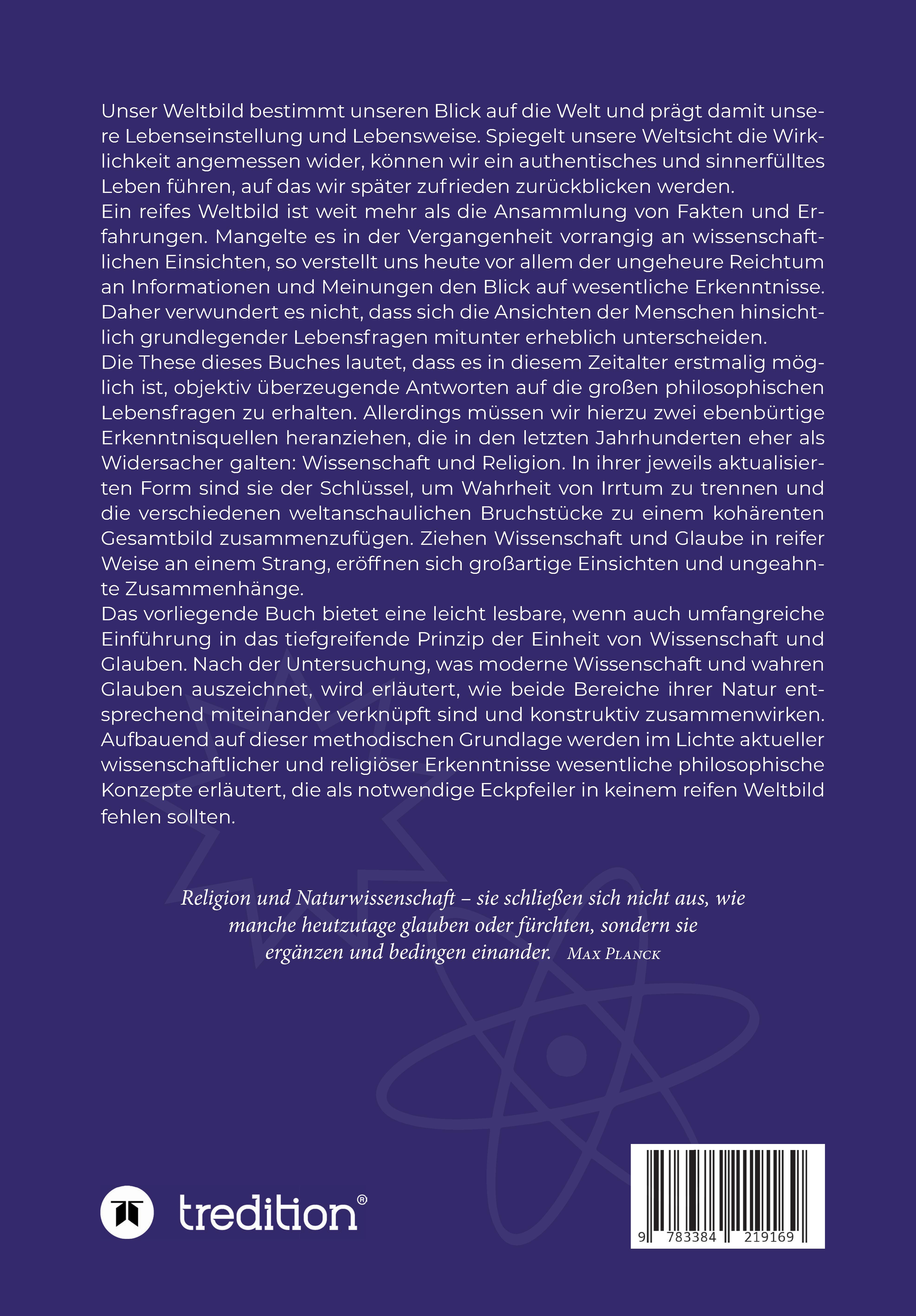 Die These dieses Buches lautet, dass es in diesem Zeitalter erstmalig möglich ist, objektiv überzeugende Antworten auf die großen philosophischen Lebensfragen zu erhalten. Allerdings müssen wir hierzu zwei ebenbürtige Erkenntnisquellen heranziehen, die in den letzten Jahrhunderten eher als Widersacher galten: Wissenschaft und Religion. In ihrer jeweils aktualisierten Form sind sie der Schlüssel, um Wahrheit von Irrtum zu trennen und die verschiedenen weltanschaulichen Bruchstücke zu einem kohärenten Gesamtbild zusammenzufügen. Ziehen Wissenschaft und Glaube in reifer Weise an einem Strang, eröffnen sich großartige Einsichten und ungeahnte Zusammenhänge.Das vorliegende Buch bietet eine leicht lesbare, wenn auch umfangreiche Einführung in das tiefgreifende Prinzip der Einheit von Wissenschaft und Glauben. Nach der Untersuchung, was moderne Wissenschaft und wahren Glauben auszeichnet, wird erläutert, wie beide Bereiche ihrer Natur entsprechend miteinander verknüpft sind und konstruktiv zusammenwirken. Aufbauend auf dieser methodischen Grundlage werden im Lichte aktueller wissenschaftlicher und religiöser Erkenntnisse wesentliche philosophische Konzepte erläutert, die als notwendige Eckpfeiler in keinem reifen Weltbild fehlen sollten.