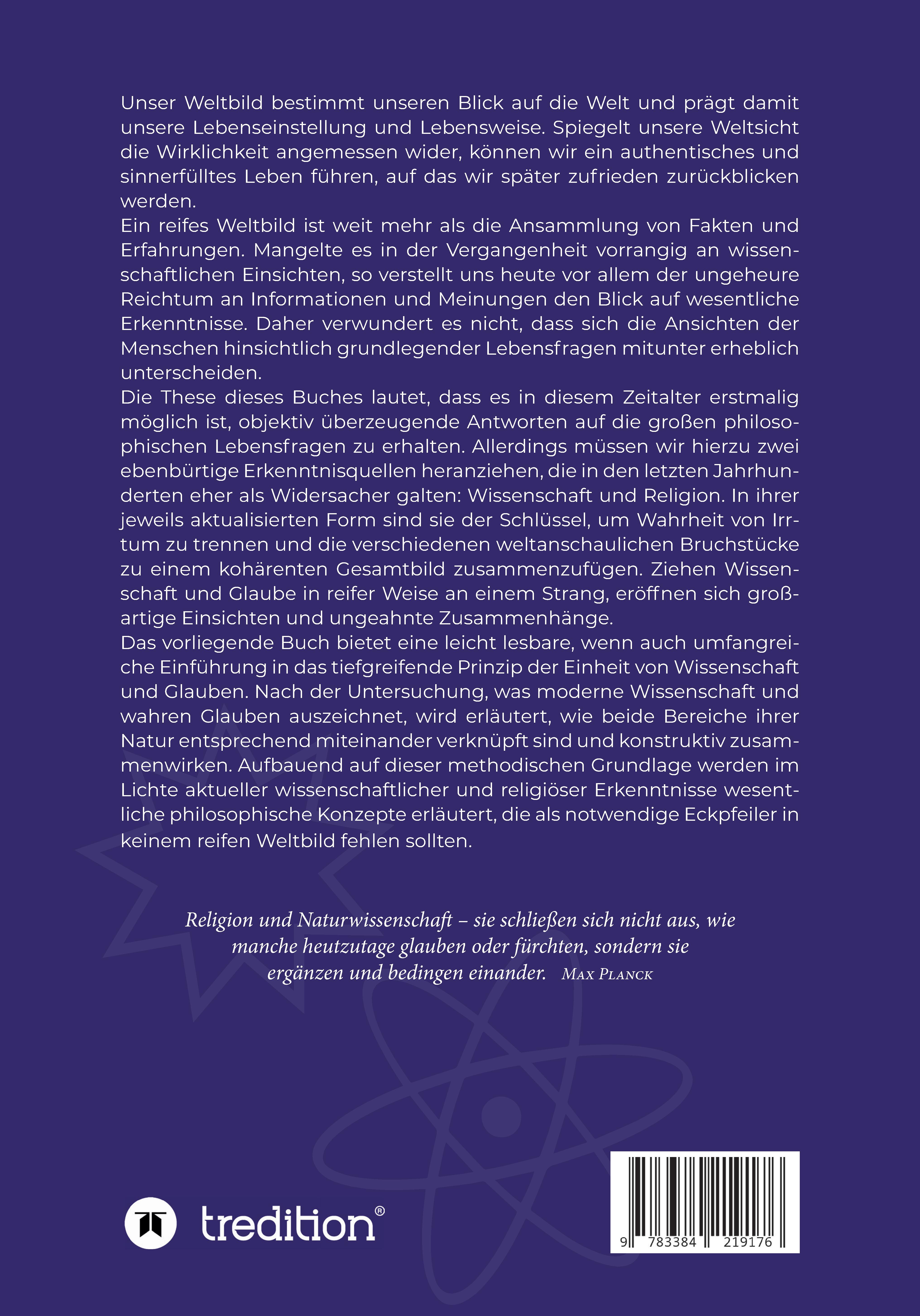 Die These dieses Buches lautet, dass es in diesem Zeitalter erstmalig möglich ist, objektiv überzeugende Antworten auf die großen philosophischen Lebensfragen zu erhalten. Allerdings müssen wir hierzu zwei ebenbürtige Erkenntnisquellen heranziehen, die in den letzten Jahrhunderten eher als Widersacher galten: Wissenschaft und Religion. In ihrer jeweils aktualisierten Form sind sie der Schlüssel, um Wahrheit von Irrtum zu trennen und die verschiedenen weltanschaulichen Bruchstücke zu einem kohärenten Gesamtbild zusammenzufügen. Ziehen Wissenschaft und Glaube in reifer Weise an einem Strang, eröffnen sich großartige Einsichten und ungeahnte Zusammenhänge.Das vorliegende Buch bietet eine leicht lesbare, wenn auch umfangreiche Einführung in das tiefgreifende Prinzip der Einheit von Wissenschaft und Glauben. Nach der Untersuchung, was moderne Wissenschaft und wahren Glauben auszeichnet, wird erläutert, wie beide Bereiche ihrer Natur entsprechend miteinander verknüpft sind und konstruktiv zusammenwirken. Aufbauend auf dieser methodischen Grundlage werden im Lichte aktueller wissenschaftlicher und religiöser Erkenntnisse wesentliche philosophische Konzepte erläutert, die als notwendige Eckpfeiler in keinem reifen Weltbild fehlen sollten.