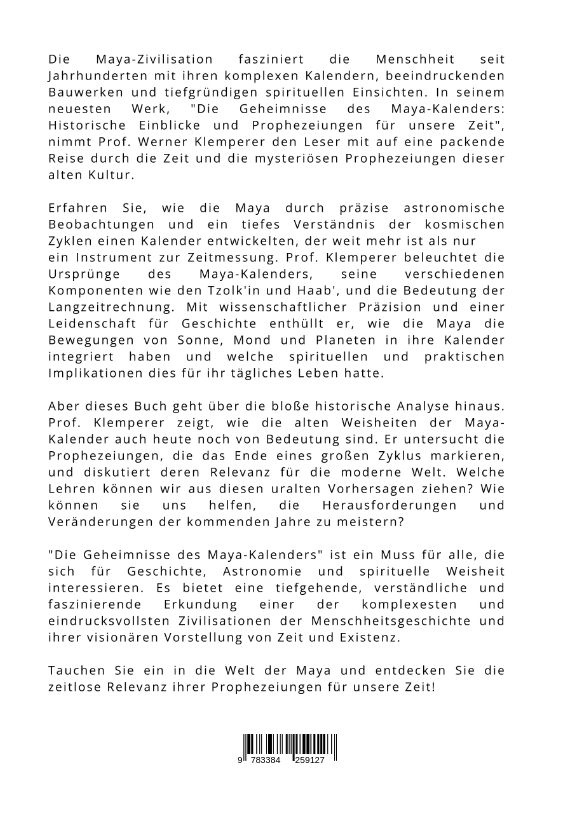 Die Maya-Zivilisation fasziniert die Menschheit seit Jahrhunderten mit ihren komplexen Kalendern, beeindruckenden Bauwerken und tiefgründigen spirituellen Einsichten. In seinem neuesten Werk, "Die Geheimnisse des Maya-Kalenders: Historische Einblicke und Prophezeiungen für unsere Zeit", nimmt Prof. Werner Klemperer den Leser mit auf eine packende Reise durch die Zeit und die mysteriösen Prophezeiungen dieser alten Kultur.Erfahren Sie, wie die Maya durch präzise astronomische Beobachtungen und ein tiefes Verständnis der kosmischen Zyklen einen Kalender entwickelten, der weit mehr ist als nurein Instrument zur Zeitmessung. Prof. Klemperer beleuchtet die Ursprünge des Maya-Kalenders, seine verschiedenen Komponenten wie den Tzolk'in und Haab', und die Bedeutung der Langzeitrechnung. Mit wissenschaftlicher Präzision und einer Leidenschaft für Geschichte enthüllt er, wie die Maya die Bewegungen von Sonne, Mond und Planeten in ihre Kalender integriert haben und welche spirituellen und praktischen Implikationen dies für ihr tägliches Leben hatte.Aber dieses Buch geht über die bloße historische Analyse hinaus. Prof. Klemperer zeigt, wie die alten Weisheiten der Maya-Kalender auch heute noch von Bedeutung sind. Er untersucht die Prophezeiungen, die das Ende eines großen Zyklus markieren, und diskutiert deren Relevanz für die moderne Welt. Welche Lehren können wir aus diesen uralten Vorhersagen ziehen? Wie können sie uns helfen, die Herausforderungen und Veränderungen der kommenden Jahre zu meistern?"Die Geheimnisse des Maya-Kalenders" ist ein Muss für alle, die sich für Geschichte, Astronomie und spirituelle Weisheit interessieren. Es bietet eine tiefgehende, verständliche und faszinierende Erkundung einer der komplexesten und eindrucksvollsten Zivilisationen der Menschheitsgeschichte und ihrer visionären Vorstellung von Zeit und Existenz.Tauchen Sie ein in die Welt der Maya und entdecken Sie die zeitlose Relevanz ihrer Prophezeiungen für unsere Zeit!
