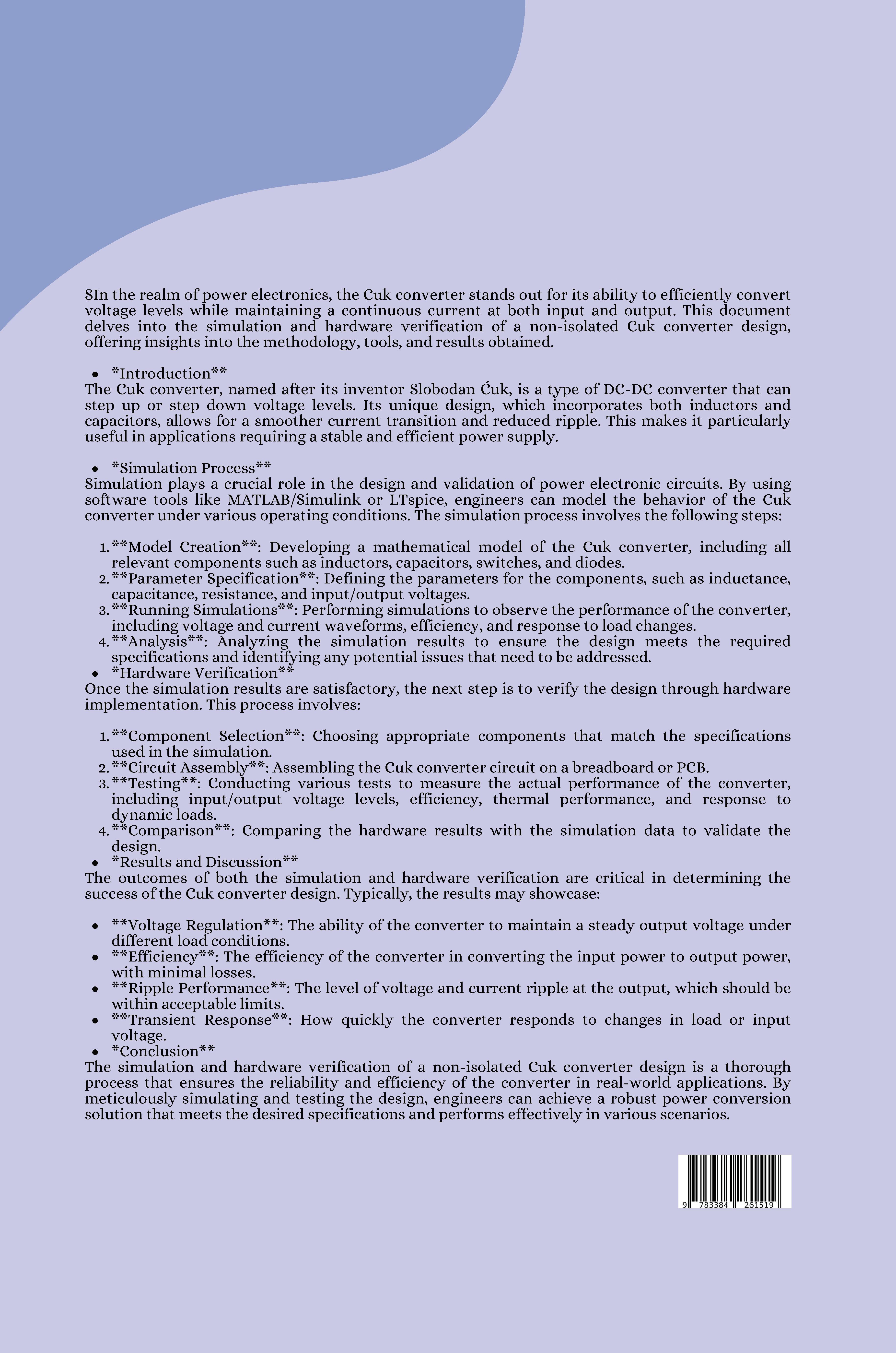 | Schlagworte | Capacitor voltage ripple • circuit simulation • Continuous conduction mode (CCM) • Converter analysis • Duty cycle • Efficiency • Inductor current • Non-isolated Cuk converter • Power Conversion • Voltage gain |