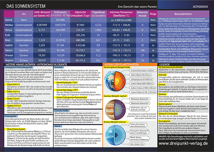 Aus dem Inhalt:- Schematische Darstellung des Sonnensystems mit wichtigen Kenngrößen- Tabelle: Daten und Besonderheiten der Sonne und der acht Planeten- Weitere Himmelskörper- Aufbau der Planetenarten- Legende