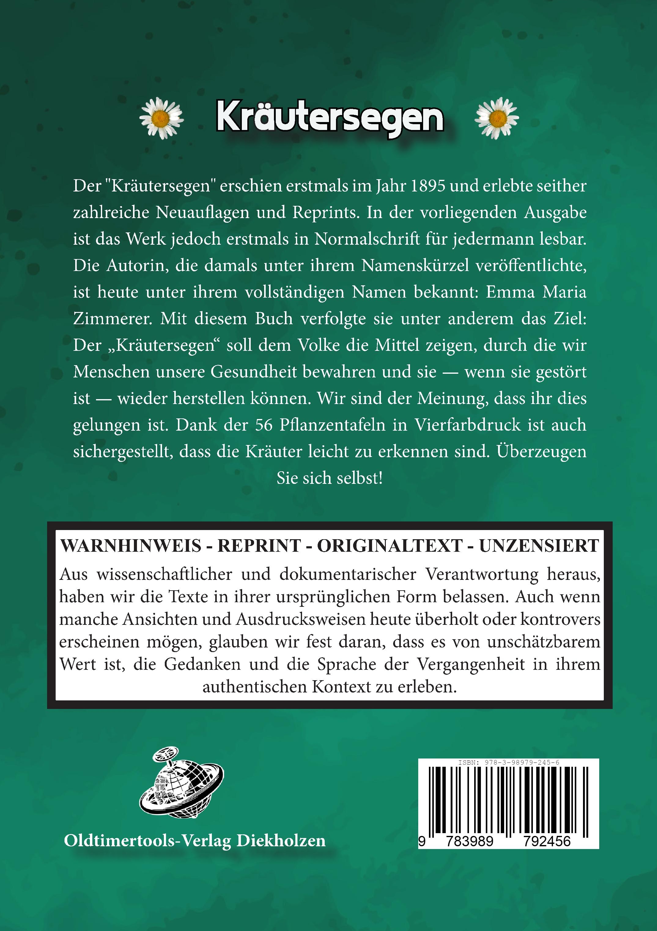 Der "Kräutersegen" erschien erstmals im Jahr 1895 und erlebte seither zahlreiche Neuauflagen und Reprints. In der vorliegenden Ausgabe ist das Werk jedoch erstmals in Normalschrift statt Fraktur, und so für jedermann lesbar. Die Autorin, die damals unter ihrem Namenskürzel veröffentlichte, ist heute unter ihrem vollständigen Namen bekannt: Emma Maria Zimmerer. Mit diesem Buch verfolgte sie unter anderem das Ziel: Der "Kräutersegen" soll dem Volke die Mittel zeigen, durch die wir Menschen unsere Gesundheit bewahren und sie - wenn sie gestört ist - wieder herstellen können. Wir sind der Meinung, dass ihr dies gelungen ist. Dank der 56 Pflanzentafeln in Vierfarbdruck ist auch sichergestellt, dass die Kräuter leicht zu erkennen sind. Überzeugen Sie sich selbst!Die Bedeutung unserer vorzüglichsten heimischen Heilkräuter in Sitte, Sage, Geschichte und Volksglauben; ihr wirtschaftlicher und industrieller Nutzen und ihre praktische Verwendung als Hausmittel.Für die Jugend, das Volk und deren Freunde zur Belebung einer religiös-sinnigen Naturanschauung gesammelt und herausgegeben von Emma Maria Zimmerer.