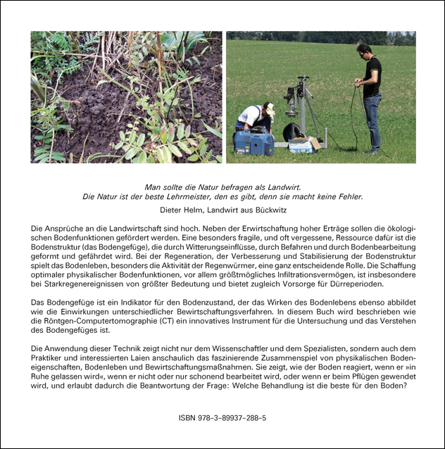 | Schlagworte | Ackerboden • Agrarwirtschaft • Bodenanalyse • Bodenbearbeitung • Bodenertrag • Bodengefüge • Bodenleben • Bodenporen • Bodenqualität • Bodenverdichtung • Bodenverschlämmung • Computertomographie • Direktsaat • Fruchtfolge • Gefügeanalyse • Infiltrationsleistung • Krümelgefüge • Landwirtschaft • Medizinisches CT • Mikro-CT • organische Düngung • Pflanzenwachstum • Regenwurm • Spatendiagnose • Streifensaat • Wasserspeicherung • Wurzelverteilung |