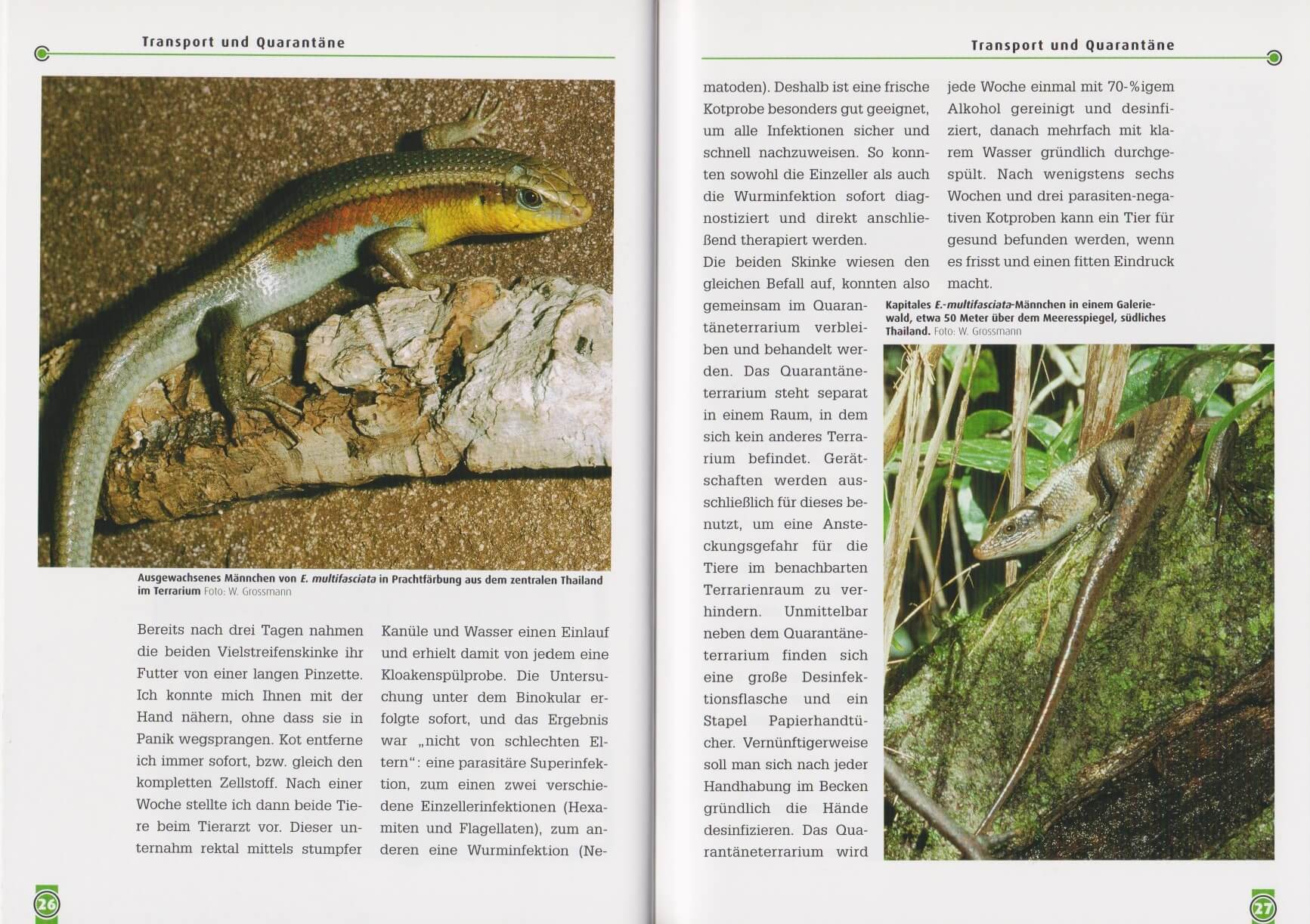 Die hier beschriebene Art Eutropis multifasciata gehört zu den Skinken, die den Boden und den Bereich niedriger Felsen, Mauern und Bäume bewohnen. Sie sind liebenswerte Gesellen, die gerne in der Nähe menschlicher Siedlungen leben, sogenannte Kulturfolger. Vielstreifenskinke werden schnell "futterzahm", sind gut haltbar, haben ein sympathisches Aussehen und so manche Besonderheit zu beiten.- Systematik und Körperbau- Die faszinierende Biologie: Aus dem Leben des Vielstreifenskinks- Alle Informationen zur artgerechten Haltung: Vom geeigneten Terrarium über Einrichtung und Technik bis hin zur Fütterung- Erfolgreich nachzüchten: Paarungsstimulation, Inkubation der Eier und Aufzucht der Jungtiere- Problemlösungen: Wie man die häufigsten Fehler bei der Pflege vermeidet, und wie man kranken Tieren helfen kann- Brillante Fotos