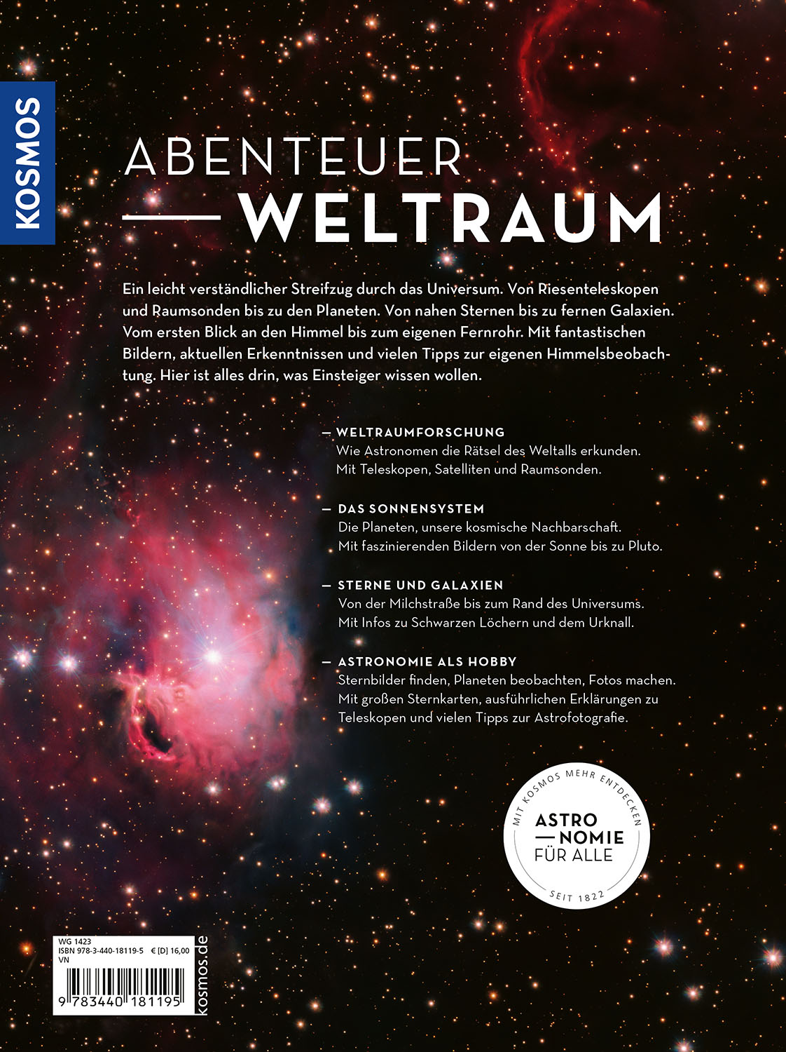 Ein leicht verständlicher Streifzug durch das Universum. Von nahen Sternen bis zu fernen Galaxien. Vom ersten Blick an den Himmel bis zum eigenen Fernrohr. Von Riesenteleskopen und Raumsonden bis zu den Planeten. Mit fantastischen Bildern, aktuellen Erkenntnissen und vielen Tipps zur Himmelsbeobachtung. Hier ist alles drin, was Einsteiger wissen wollen.