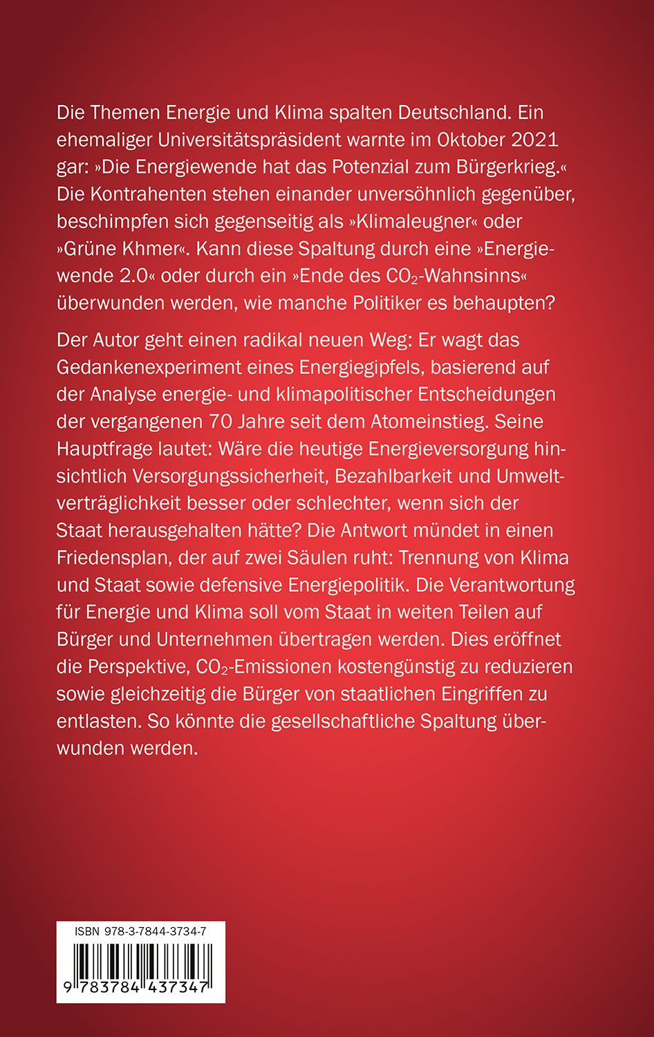Der Autor geht einen radikal neuen Weg: Er wagt das Gedankenexperiment eines Energiegipfels, basierend auf der Analyse energie- und klimapolitischer Entscheidungen der vergangenen 70 Jahre seit dem Atomeinstieg. Seine Hauptfrage lautet: Wäre die heutige Energieversorgung hinsichtlich Versorgungssicherheit, Bezahlbarkeit und Umweltverträglichkeit besser oder schlechter, wenn sich der Staat herausgehalten hätte? Die Antwort mündet in einen Friedensplan, der auf zwei Säulen ruht: Trennung von Klima und Staat sowie defensive Energiepolitik. Die Verantwortung für Energie und Klima soll vom Staat in weiten Teilen auf Bürger und Unternehmen übertragen werden. Dies eröffnet die Perspektive, CO2-Emissionen kostengünstig zu reduzieren sowie gleichzeitig die Bürger von staatlichen Eingriffen zu entlasten. So könnte die gesellschaftliche Spaltung überwunden werden.