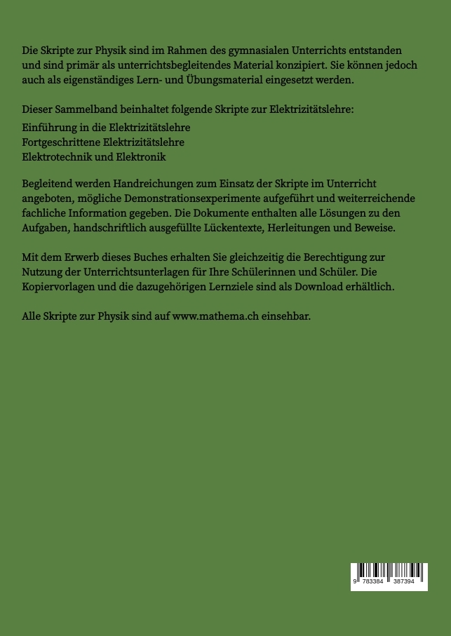 Die Skripte zur Physik sind im Rahmen des gymnasialen Unterrichts entstanden und sind primär als unterrichtsbegleitendes Material konzipiert. Sie können jedoch auch als eigenständiges Lern- und Übungsmaterial eingesetzt werden.Dieser Sammelband beinhaltet die folgenden Skripte zur Elektrizitätslehre:Einführung in di ElektrizitätslehreFortgeschrittene ElektrizitätslehreElektrotechnik und ElektronikBegleitend werden Handreichungen zum Einsatz der Skripte im Unterricht angeboten, mögliche Demonstrationsexperimente aufgeführt und weiterreichende fachliche Information gegeben. Die Dokumente enthalten alle Lösungen zu den Aufgaben, handschriftlich ausgefüllte Lückentexte, Herleitungen und Beweise. Mit dem Erwerb dieses Buches erhalten Sie gleichzeitig die Berechtigung zur Nutzung der Unterrichtsunterlagen für Ihre Schülerinnen und Schüler. Die Kopiervorlagen und die dazugehörigen Lernziele sind als Download erhältlich.Alle Skripte zur Physik sind auf www.mathema.ch einsehbar.