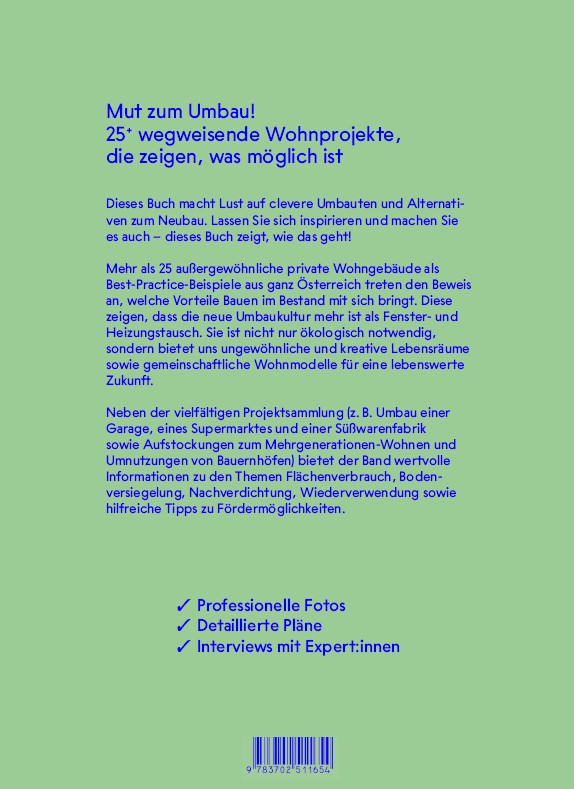 In diesem praxisorientierten Leitfaden werden 25 inspirierende, private Wohngebäude gezeigt, deren Besitzer:innen und Architekt:innen den Geist der Stunde erkannt haben und die den Beweis antreten, dass Bauen im Bestand viele Vorteile mit sich bringt. Es spart nicht nur Ressourcen und schont die Landschaft, sondern ist auch nachhaltig und schafft soziale Verdichtung.