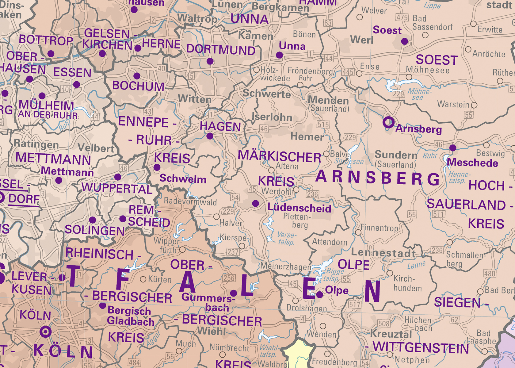 Politische Wandkarte mit Aufhänger und Metall-Bestäbung auf Hochglanzpapier. Maßstab 1:750.000. Auf einer Kartenfläche von ca. 96 cm x 140 cm (Breite x Höhe) bildet die Karte unter anderem Verkehrswege, administrative Grenzen (Staats-, Landes-, Regierungsbezirks- und Landkreisgrenzen), Städte, Signaturen, Kartengitternetz und eine zweisprachige Legende in Deutsch und Englisch ab.Diese Karte gibt es auch als unbestäbte Version ohne Aufhänger, ISBN 978-3-86482-155-4.Weiterhin ist das Kartenbild als gefalzte Karte im Maßstab 1:1.000.000 mit der ISBN 978-3-86482-152-3 erhältlich.