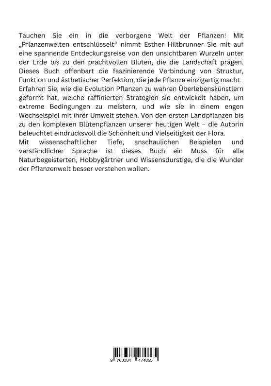 Tauchen Sie ein in die verborgene Welt der Pflanzen! Mit "Pflanzenwelten entschlüsselt" nimmt Esther Hiltbrunner Sie mit auf eine spannende Entdeckungsreise von den unsichtbaren Wurzeln unter der Erde bis zu den prachtvollen Blüten, die die Landschaft prägen. Dieses Buch offenbart die faszinierende Verbindung von Struktur, Funktion und ästhetischer Perfektion, die jede Pflanze einzigartig macht.Erfahren Sie, wie die Evolution Pflanzen zu wahren Überlebenskünstlern geformt hat, welche raffinierten Strategien sie entwickelt haben, um extreme Bedingungen zu meistern, und wie sie in einem engen Wechselspiel mit ihrer Umwelt stehen. Von den ersten Landpflanzen bis zu den komplexen Blütenpflanzen unserer heutigen Welt - die Autorin beleuchtet eindrucksvoll die Schönheit und Vielseitigkeit der Flora.Mit wissenschaftlicher Tiefe, anschaulichen Beispielen und verständlicher Sprache ist dieses Buch ein Muss für alle Naturbegeisterten, Hobbygärtner und Wissensdurstige, die die Wunder der Pflanzenwelt besser verstehen wollen.